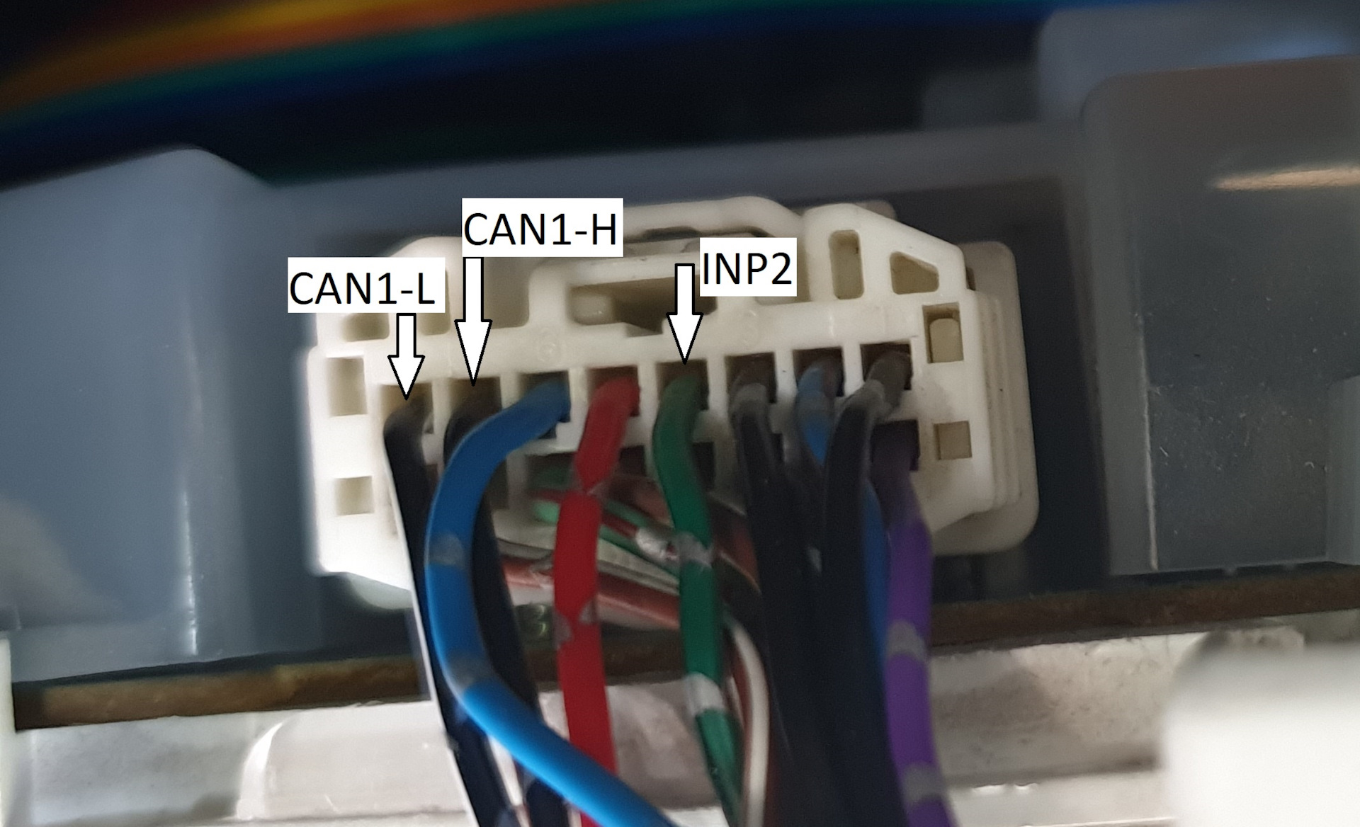 INP2 _ _ _ _ к панели приборов, оказалось важный проводок, здесь должен появляться + при любом способе включения зажигания иначе блок сигнализации перестаёт адекватно считыват данные с CAN (обороты двигателя), а ещё без него после автозапуска отваливается радиоканал сигналки (это ваще мегажопа).