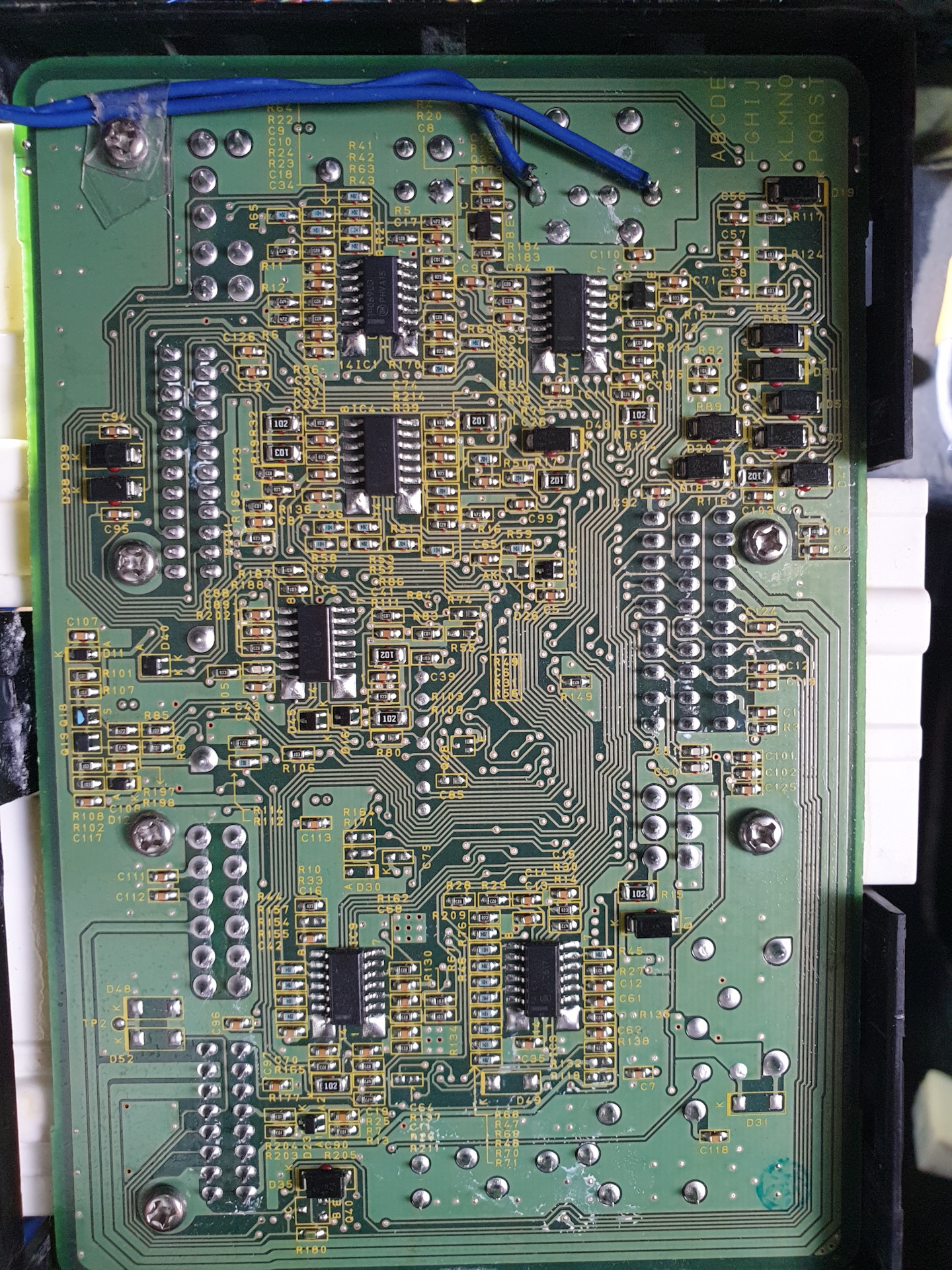режем дорожку к крайнему реле с двух сторон сверлим отверстие и паяем новый проводок. Я использовал лишний провод от реле R2 зелено-черный. Кстати про реле R2 Оставшиеся 2 провода подключаем проводкам желтого разъема под рулём. Манипуляции с этим разъёмом лучше проводить с отключенным аккумулятором. Там есть жёлто-чёрный и жёлто-красный провод при удачном воздействии на них приводит к сюрпризу в виде прилёта подушки руля в лицо.