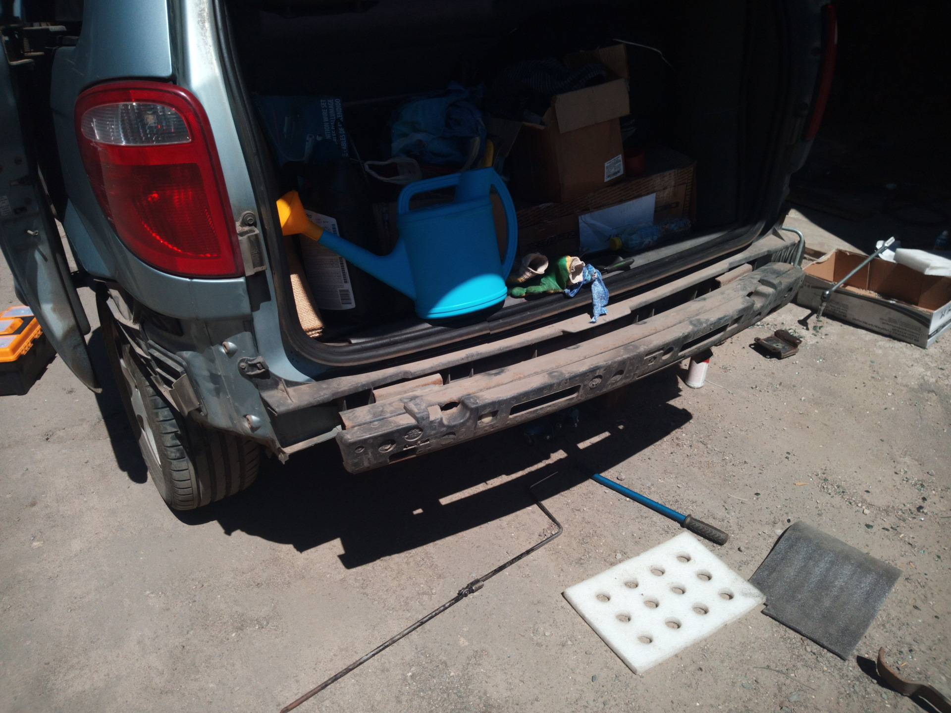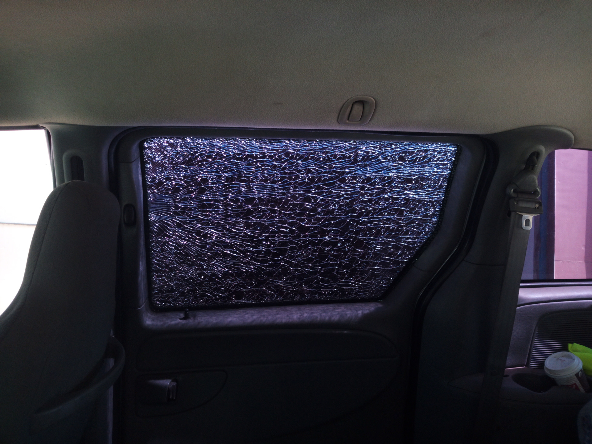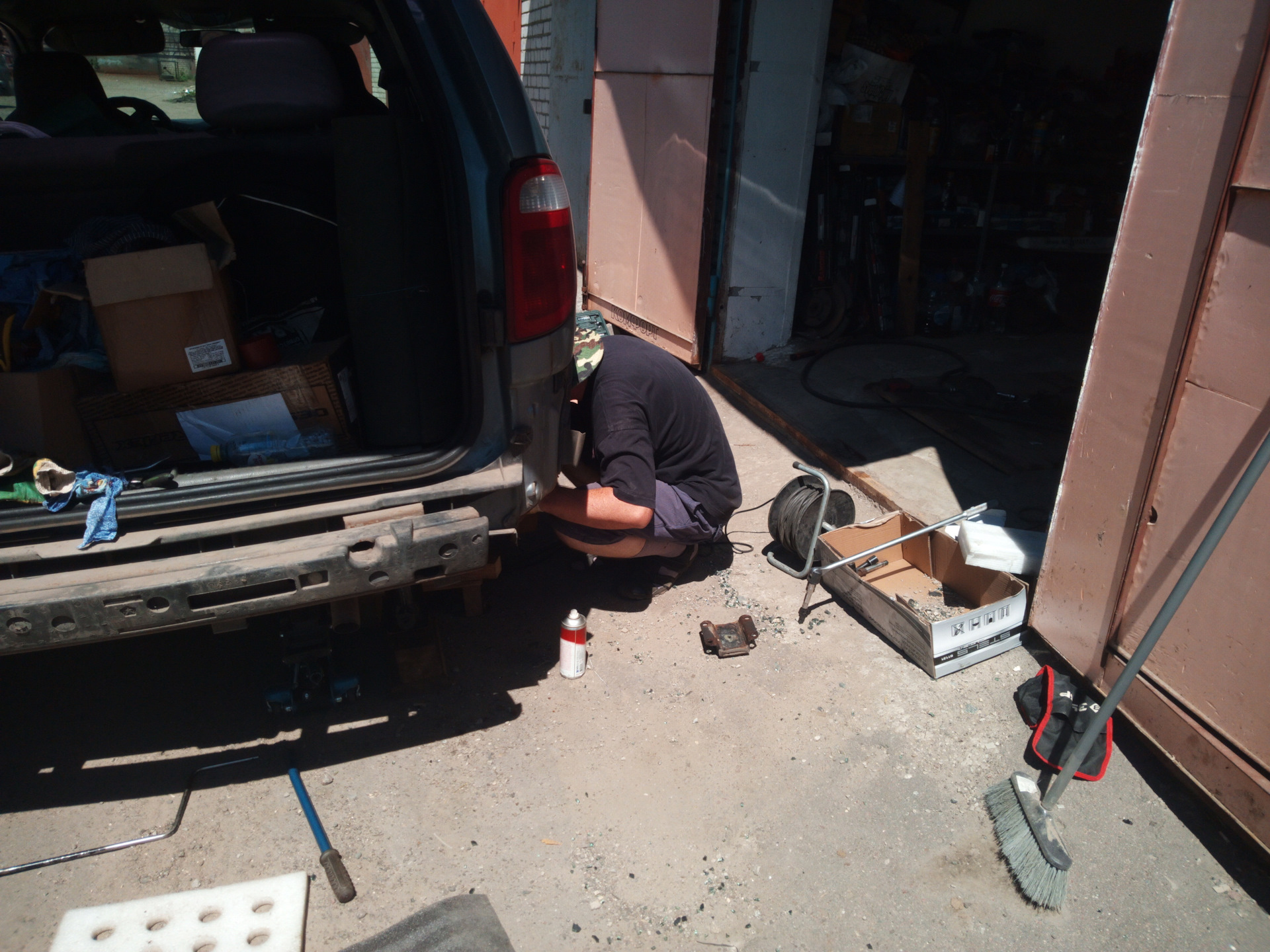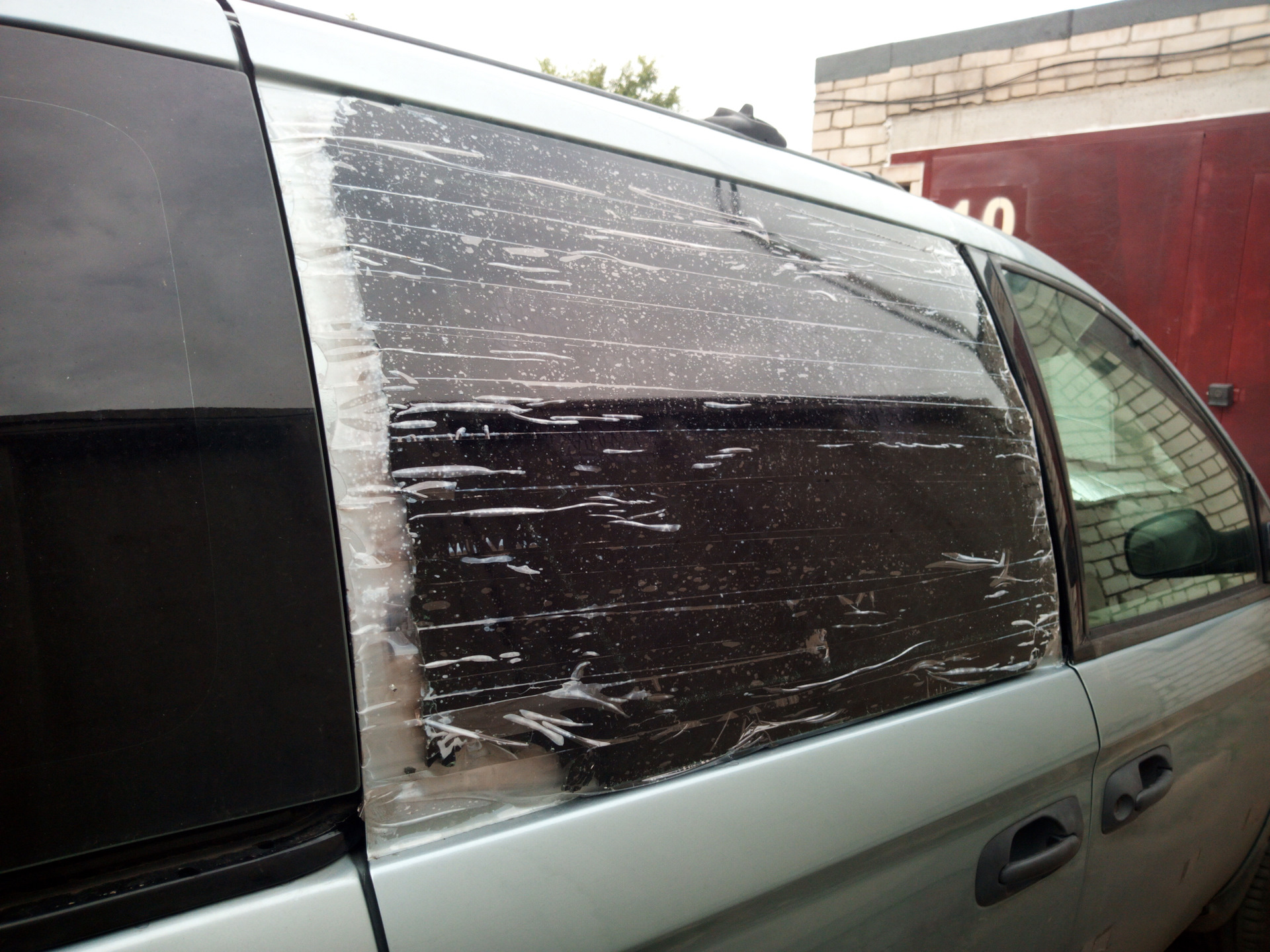 Замена пошла по самому жёсткому сценарию. Для начала в процессе доставания рессоры из салона коллега чиркнул рессорой по стеклу сдвижной двери и оно благополучно пошло трещинами (потрескивало ещё минут десять), часть стекла осыпалась, часть осталась висеть на тонировке, повздыхали, заклеили остатки стекла скотчем, ну и раз уж начали решили продолжать.