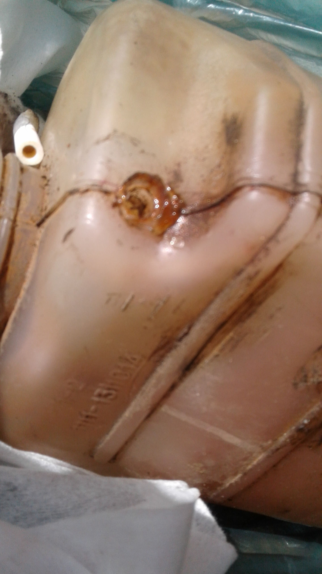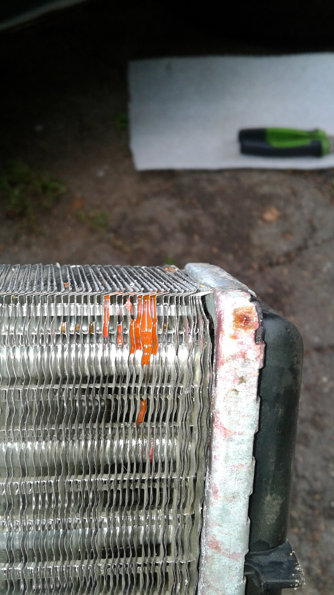Совет один: рубашку охлаждения промывать, причем тщательно. Если эта дрянь останется — забьет соты радиаторов. Основной радиатор — на выброс, однозначно. На фотке видно, что он дырявый. Печку можно попробовать снять и промыть, если латунная. Если алюмин — на помойку.