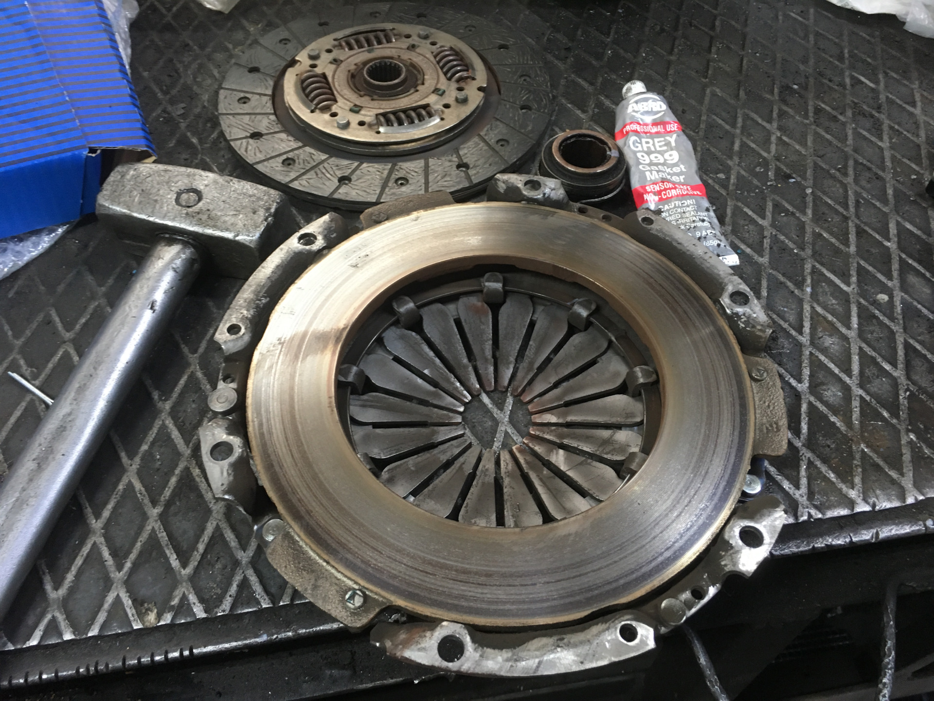 Мои запчасти: диск сцепления, корзина, выжимной подшипник и маховик. (12000р). Остальное докупил у них на месте. Покупал на всякий пожарный и маховик, но он не пригодился. Закинул обратно в багажник. Есть нюанс по выжимному подшипнику… Официальный дилер дал мне парт/номера оригинальных запчастей. По этому номеру заказал подшипник, а приехал аналог((( и в сервисе сказали, что приезжают с аналогичными подшипниками. Так что имейте ввиду. А моя корзина Sachs ехала аж со Ставрополья. Ждал почти 2 недели. Корзина и диск сцепления как мне сказали в хорошем состоянии. Я оставил там у них всё старое.