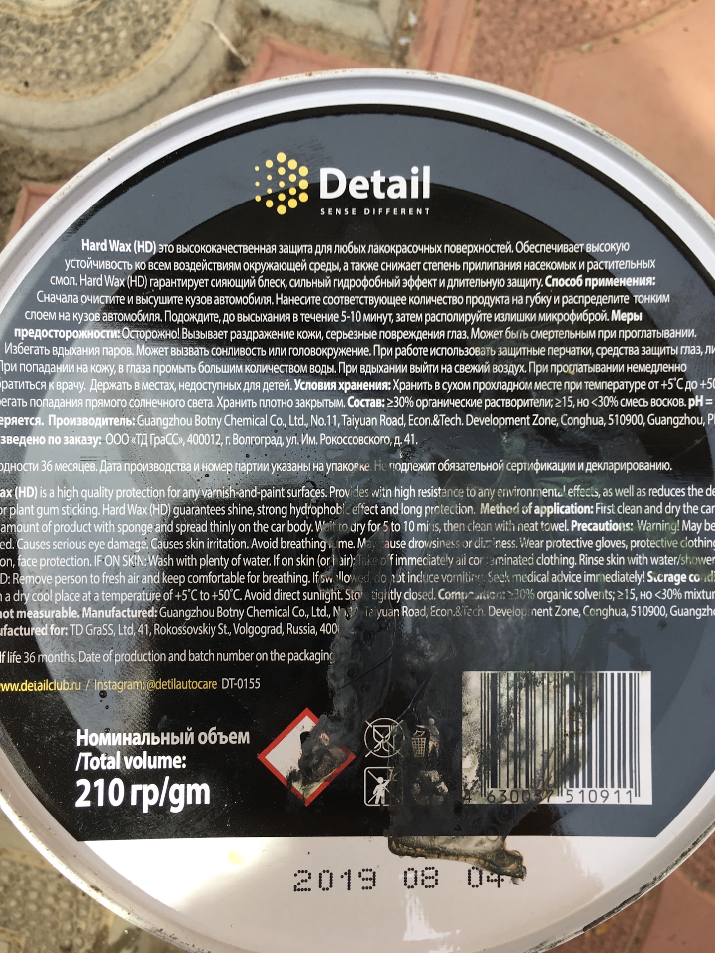 Нано полироль от Runway мне не понравилась, Fusso 12 Month от Soft99 я не нашел в ближайшем магазине, поэтому прикупил Твердый воск Detail Hard Wax 200гр GRASS. Помыл авто шампуньками, полирнул царапины пастой 3М-74, всю машину прошелся 3М-76 и нанес твердый воск, после нанесения машина преобрела жирный блеск и на ощупь жирная… будем посмотреть сколько продержится! Нанес антидождь и антизапотеватель.