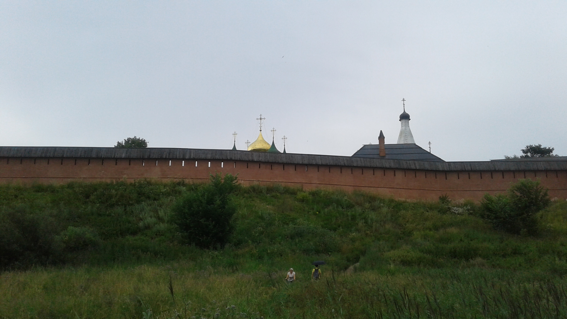 Пока ждем и едим — дождь почти заканчивается. Тут же покупаем у частников замечательных суздальских огурцов и помидоров и идем гулять дальше. Совсем недалеко от Гостиных Рядов находятся остатки крепостных валов.