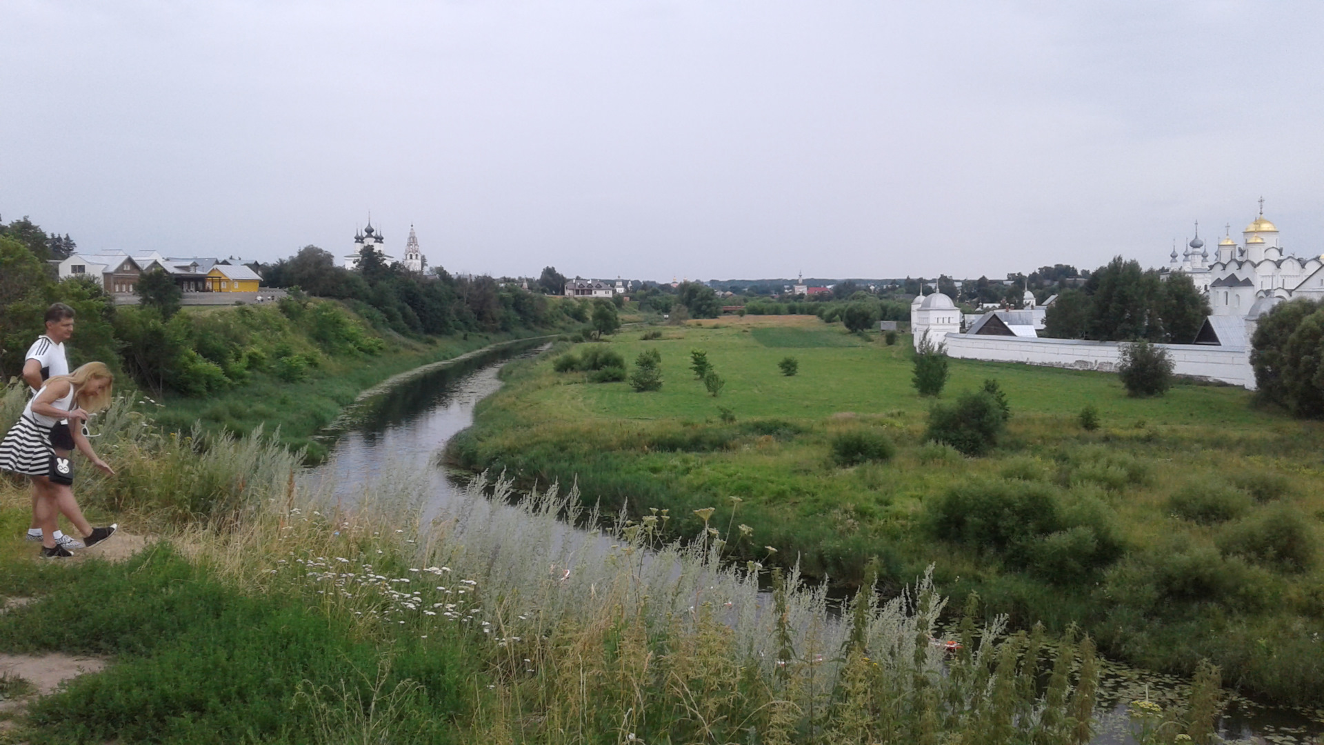 В речке полно наглых откормленных диких уток, кувшинок и купающейся чуть выше пешеходного моста ребятни. Идем через мостик на противоположный берег к белеющему вдали Свято-Покровскому Суздальскому женскому монастырю.