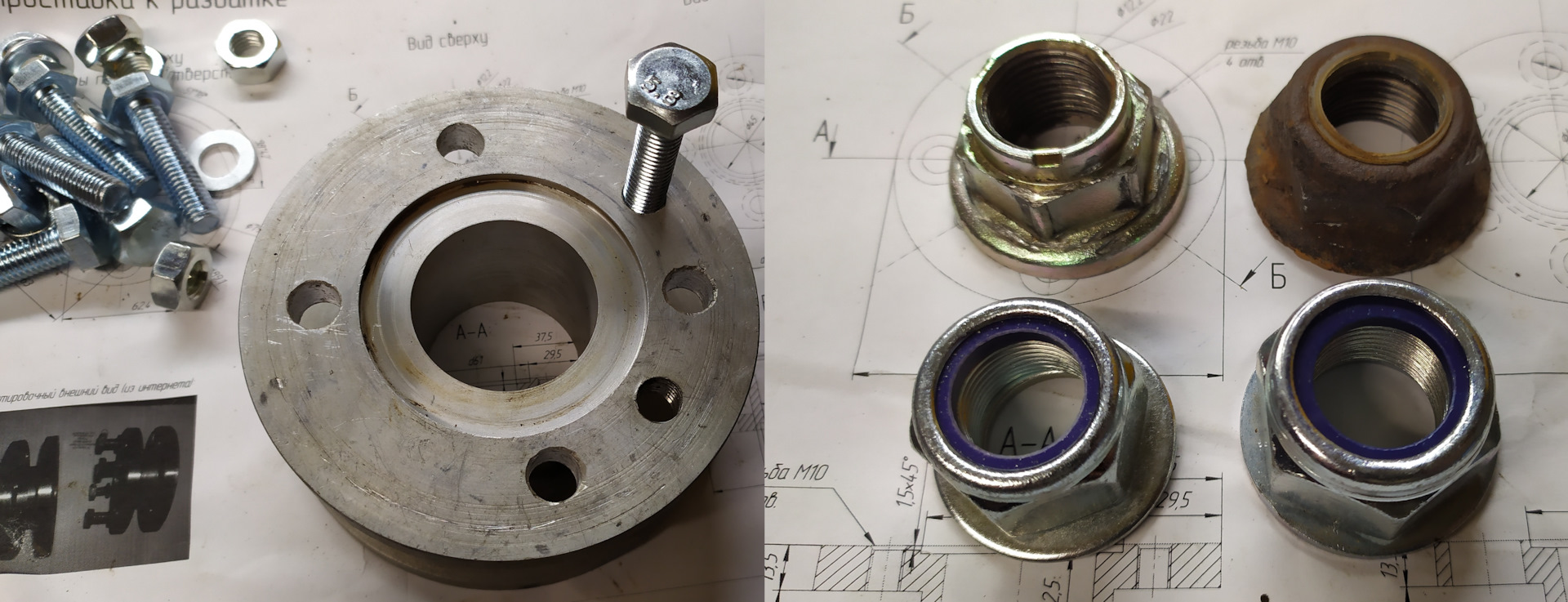 Возвращаемся к рассказу, значит, набрался я храбрости, расчехлил свой электронный штангенциркуль и полез делать замеры под машину и колдовать с чертежами. Изменил практически все размеры, кроме разве что габаритных. Изначальный чертёж был сделан вообще не в масштабе. Также к чему пришел — резьба в проставке вообще не нужна ни в одном отверстии и самое главное — найти токаря который сделает отверстия по чертежу — нереально, а если реально то ценник — в сравни цене нового оригинального кардана. Приведены в порядок размеры "центрирующих выступов" в соответствии с нашими фланцами и фланцами кардана УАЗа. Сверлить отверстия токарь не взялся (который делал проставки), вероятность попаданий стремилась к нулю, поэтому фактическое совпадение отверстий не гарантирую. Тем более, мои замеры не сходятся с замерами которые на форуме и на драйве в некоторых местах, к примеру посадочные размеры кардана оригинального — возможно в природе существуют разные карданы на тагерах, но это не точно…. Но я снимал точно, в идеале конечно всё всегда перепроверять. А вообще в идеале — брать новый кардан, снимать фланцы и везти к токарю (я возил к уже другому) сверлить по "факту" что я и сделал и вообще ни капли не пожалел. P.S. — откручивать гайки с фланцев — нереально, поехал на сервис "срывать" гайковёртом — мой вам совет также не тратить время, а отдать 300 рублей и сэкономить кучу матерных слов — но гайки только ослабить, потому что потом ехать обратно и снимать фланцы, соответственно всё масло из раздатки и моста вытечет.
