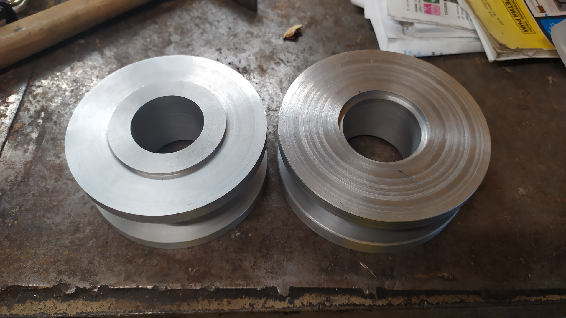 Второй важный момент — проставка должна быть из алюминия, забудьте про сталь — будет конски весить, тонну, что приведёт к разбитию подшипников и течи сальников, полно таких историй на драйве. По совету "бывалого" токаря, делавшего аналогичные изделия, был выбран алюминий Д16Т — по цене 1800 за две болванки моего размера. Это сплав лёгкий и прочный — то что нужно! Токарю отдал за выточку двух проставок 2000 рублей.