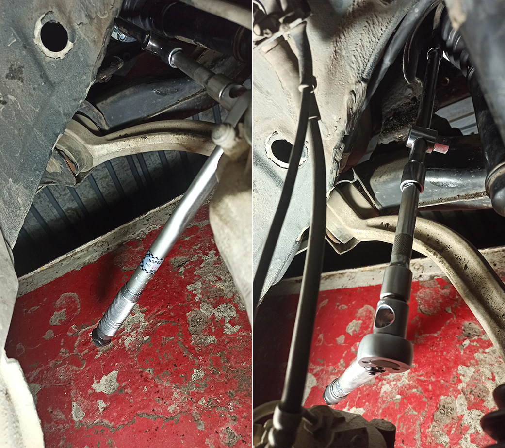 2. Ослабляем болт наружного шруса (болт закручен с большим усилием, использовал г-образный шестигранник на 14 и метровый кусок трубы, для сохранения лкп колесо немного поворачиваем)