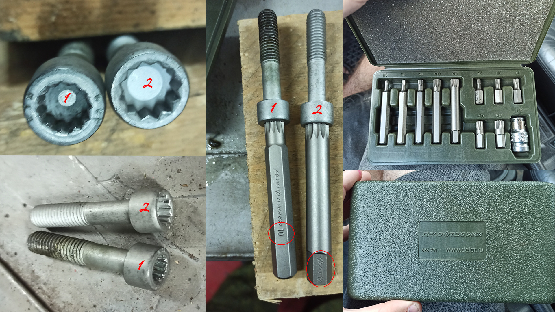 8. С болтами вышел казус. в комплекте с пыльником шли новые болты SPLINE на 12 к которым идеально подходит TORX который у меня был в наборе, но на авто стояли болты SPLINE 10 к которому не подходит не TORX не шестигранники ( проверял, только слизал грани звезды, вывод нужен набор бит под SPLINE). Поискав у товарищей биты SPLINE был найден такой набор и дело двинулось с мертвой точки. на фото под №1 старый болт под №2 новый.