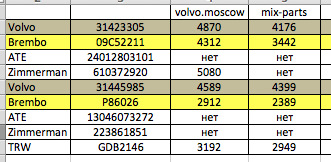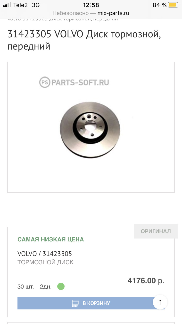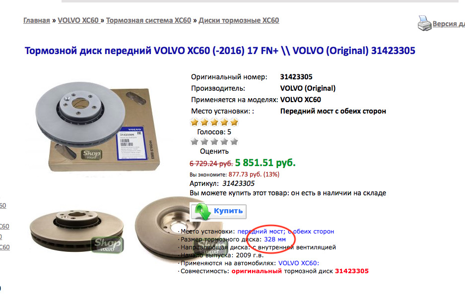 Коллеги из чата «XC60 Club” скинули номера нужных дисков 31423305 и колодок 31445985. Смотрю по инету диски 328 мм.