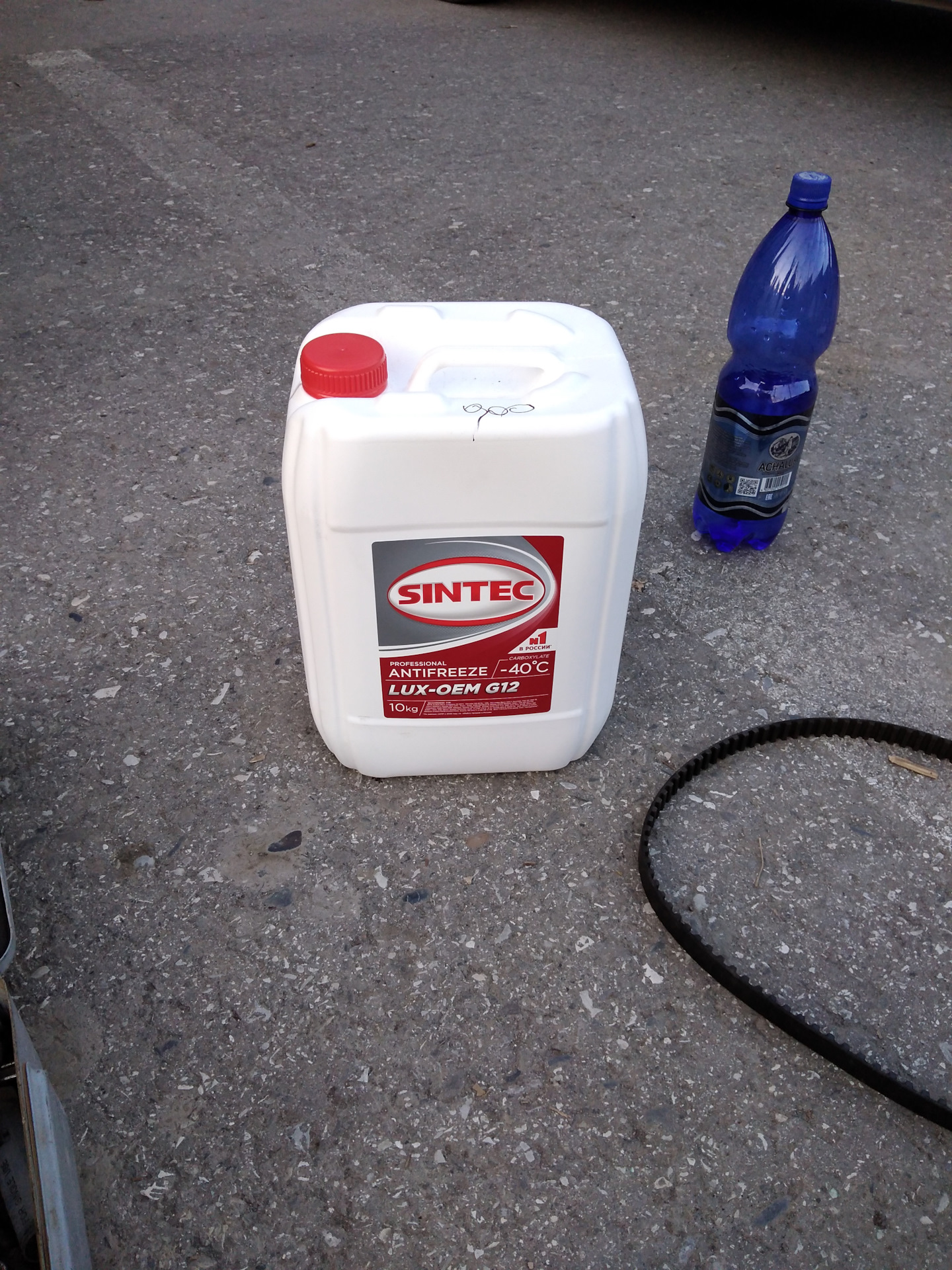 Пощупал помпу — вроде ничего не болтается и не люфтит, трогать не стал. Но, так как давно собирался, решил поменять охлаждающую жидкость. Купил 10 кг Синтек, вроде народ неплохо отзывается. Взял красный, так как его подтёки обычно хорошо заметны: