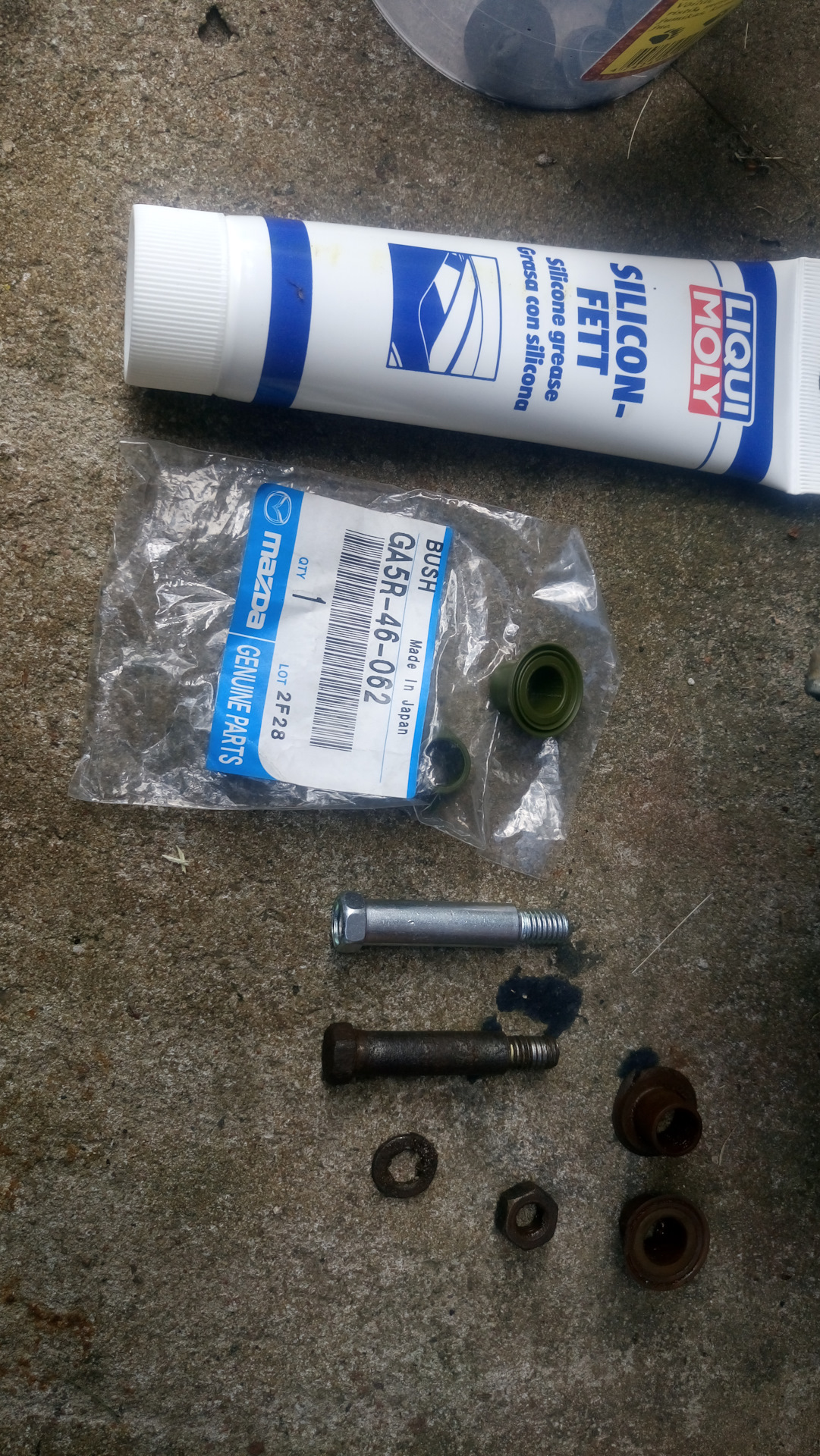 Код втулок Mazda GA5R-46-062 — 2 шт, точного кода оси не знаю, отсыпали из пакета ))) но это тоже оригинал Mazda — ось со стороны рычага КПП. ИТОГО Оригинальные запчасти МАЗДА (две втулки и ось) обошлись в 23,41 EUR (гайку взял стандартную, с копролоновым фиксатором, её цену не учитываю)