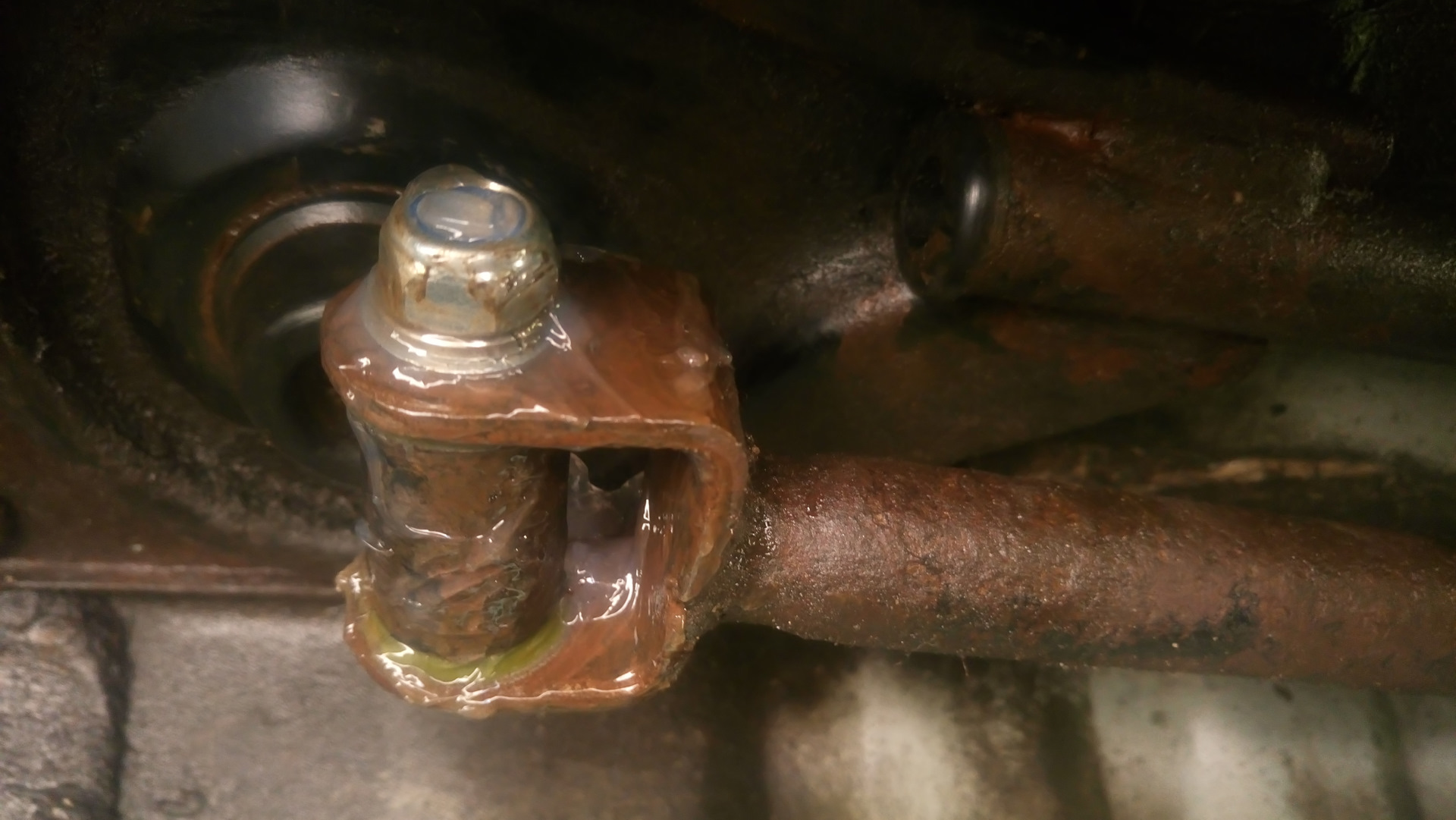 Со стороны рычага ощутимый люфт, шатается буквально от руки. Стоит гайка на 13 с гроверной шайбой, т.е. туда уже лазили. Причем смазку использовали явно не водостойкую – она вся ржавая и не вязкая.