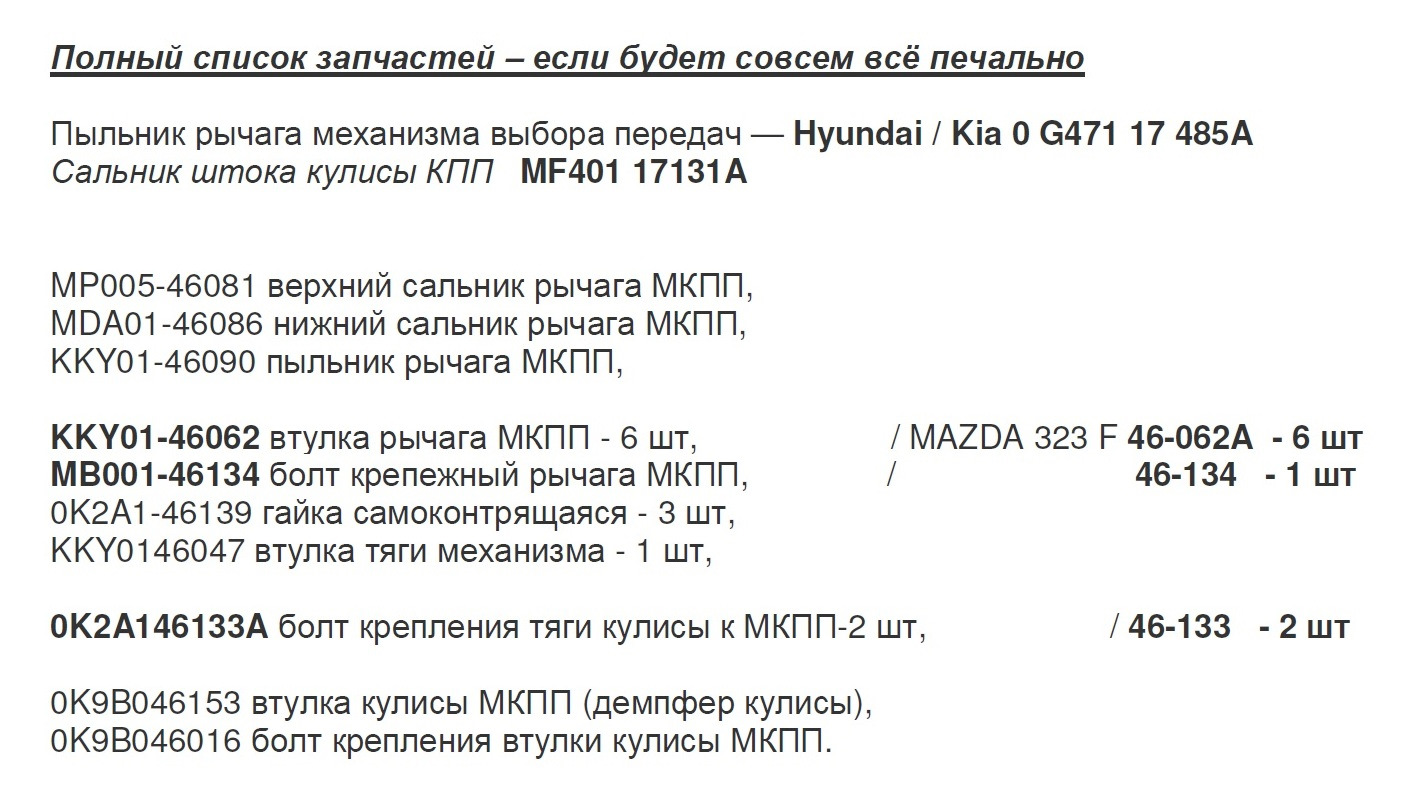 Почитав бортжурналы по МАЗДЕ/КИА был составлен следующий примерный список возможно потребующихся запчастей.