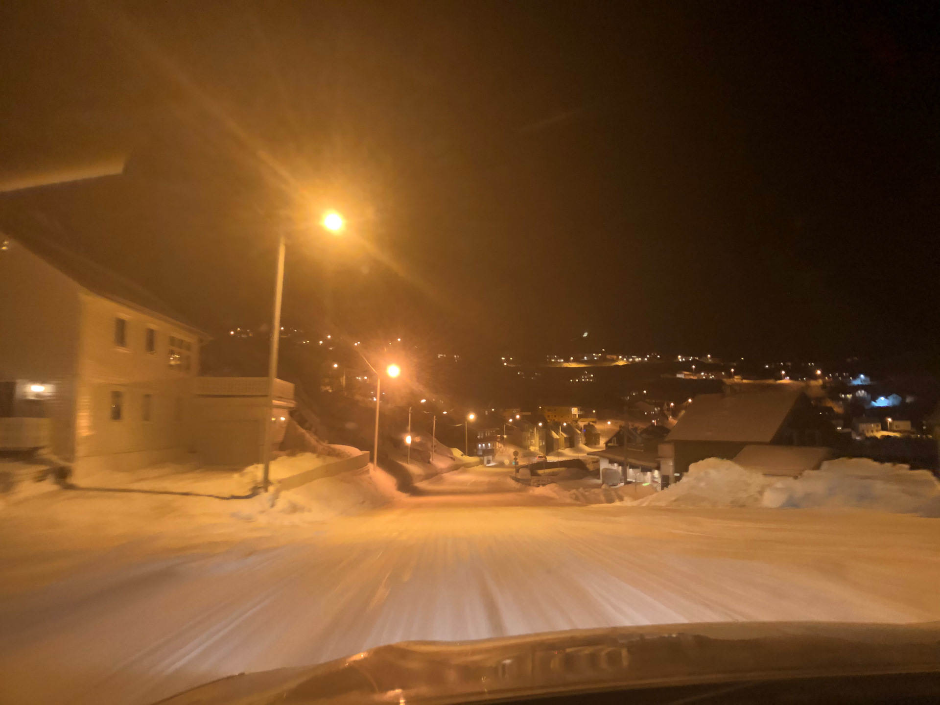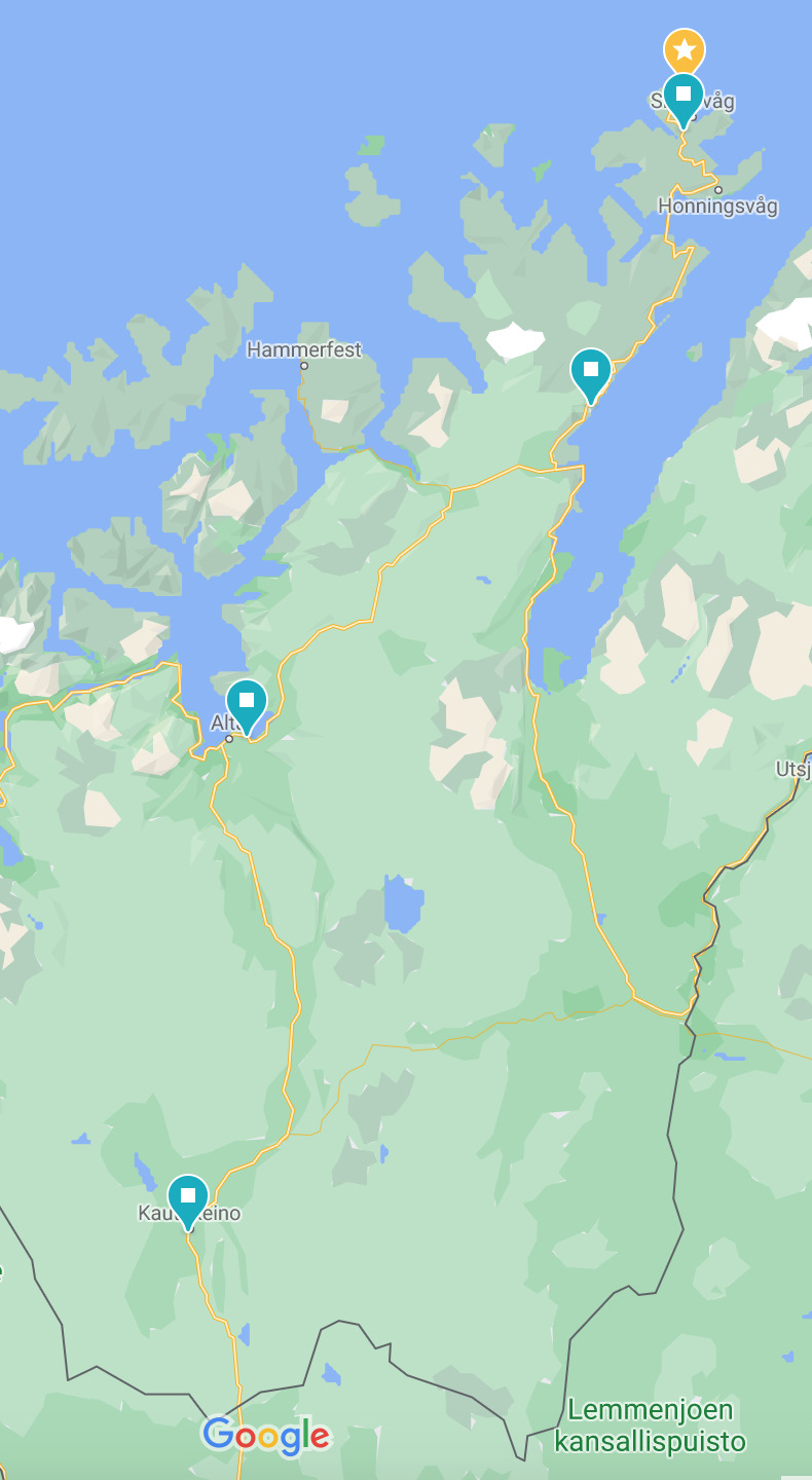 Летом можно жить в кучи кемпингов, зимой нет. Почитав интернеты выяснил, что самое надежное — это ехать в Honningsvåg (Хоннингсвог). Обычная рыбацкая деревня, есть несколько гостиниц. 1 Бар. Магаз с бухлом тоже есть. Заправка! )) Построили маршрут до нее.