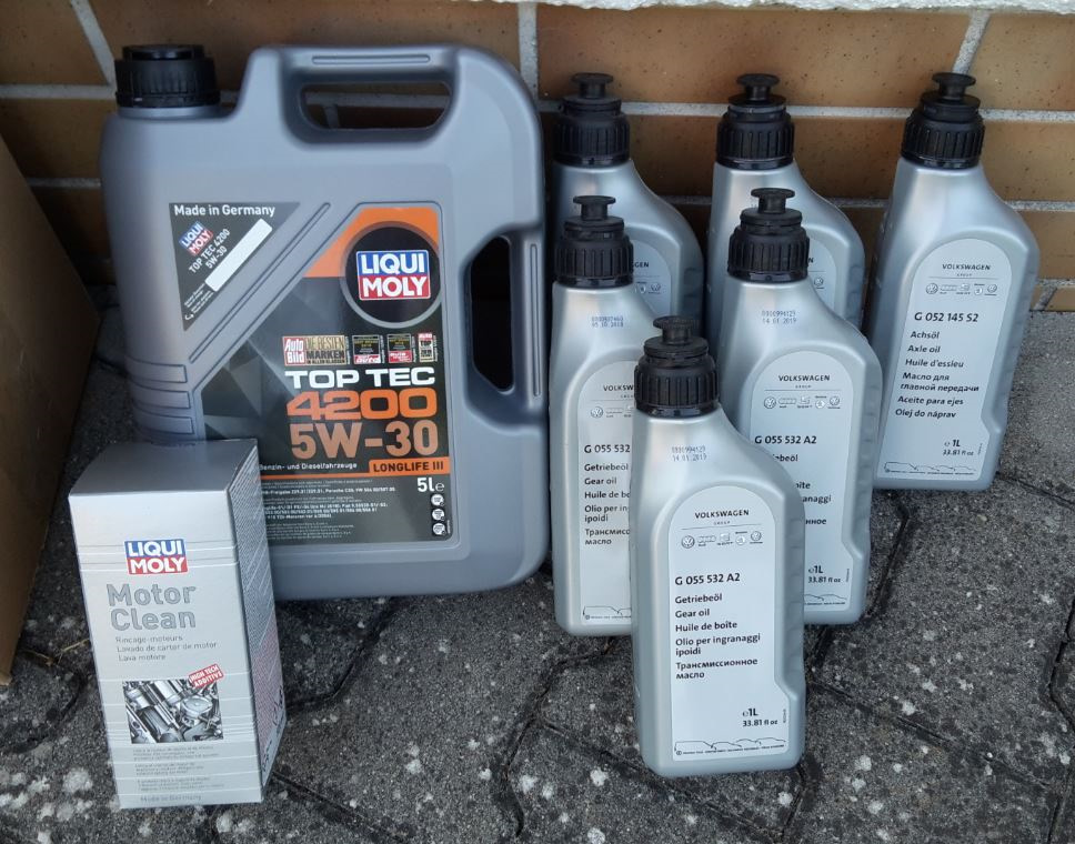 Для коробки надо 4,5 литра (у меня ушло 4,2л.) — G 055 532 A2, в задний мост 0,9 литра (я залил 1 л. и у меня оно не вытекало) — G 052 145 S2.
