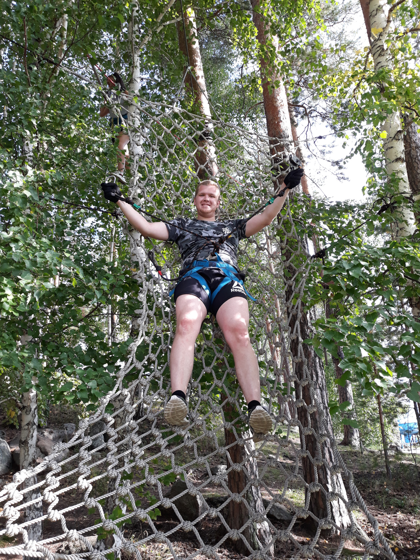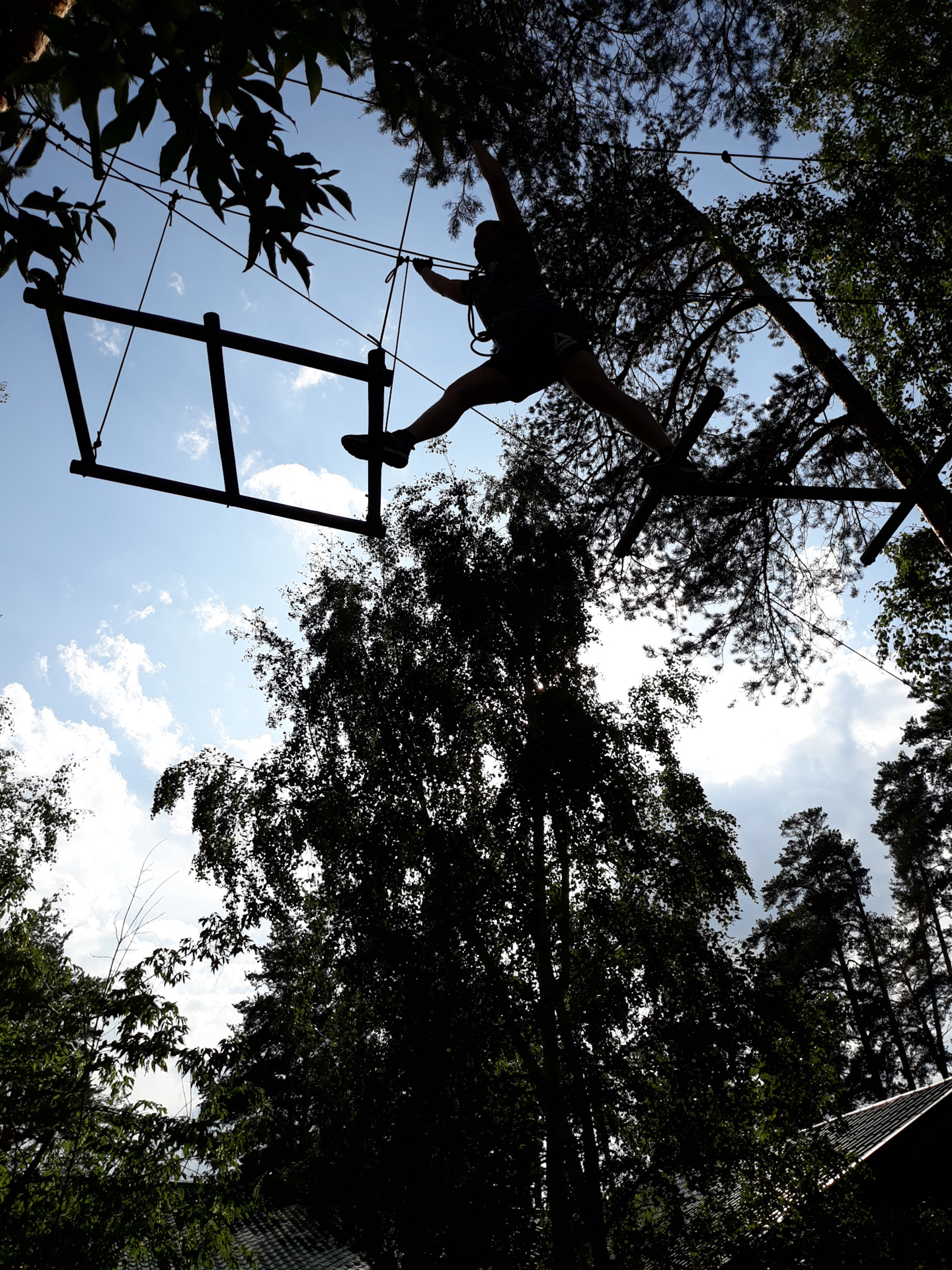 На следующий день чёрт дёрнул меня полезть по трассе верёвочного городка в Экстрим-Парке… тоже под допингом)) Было прикольно) и да, трасса реально длинная) минут 30-40 и участков 20 с чем-то наверно)