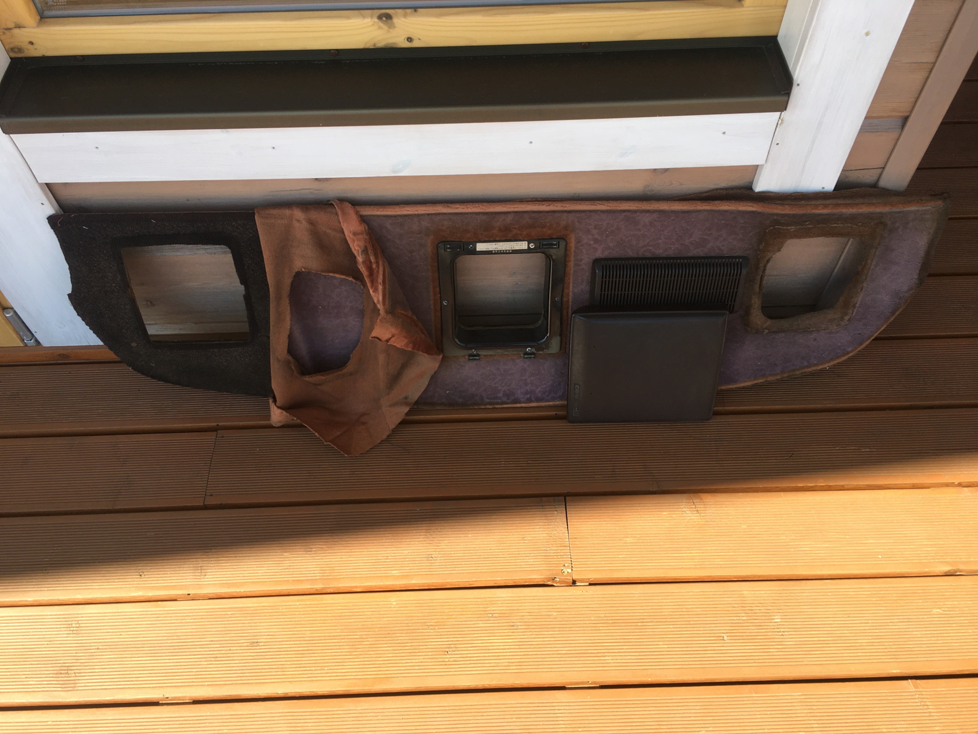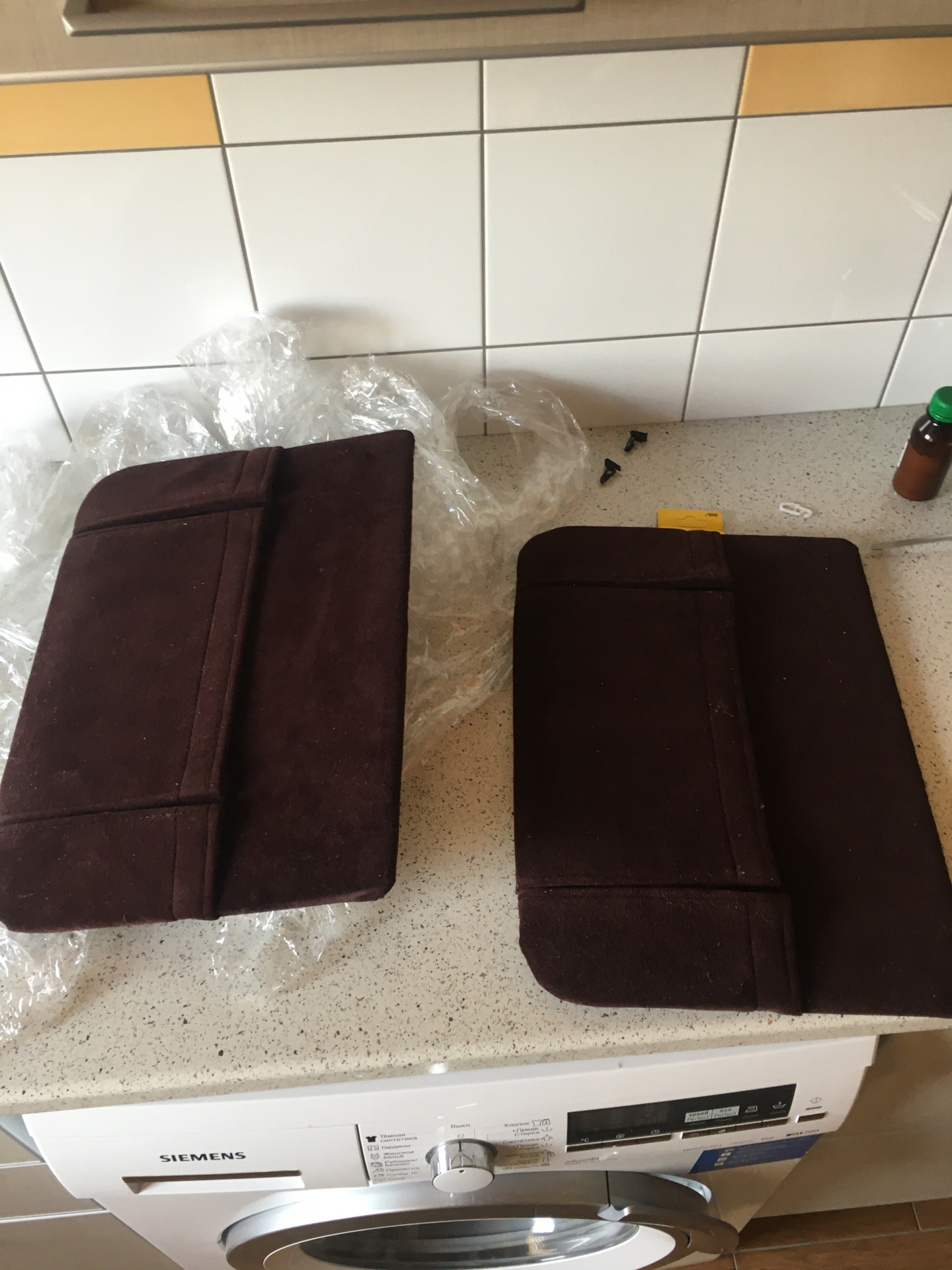 После чего просверливаем необходимые отверстия, приклепываем клипсы и обтягиваем заводским, но уже чистым после стирки велюром.