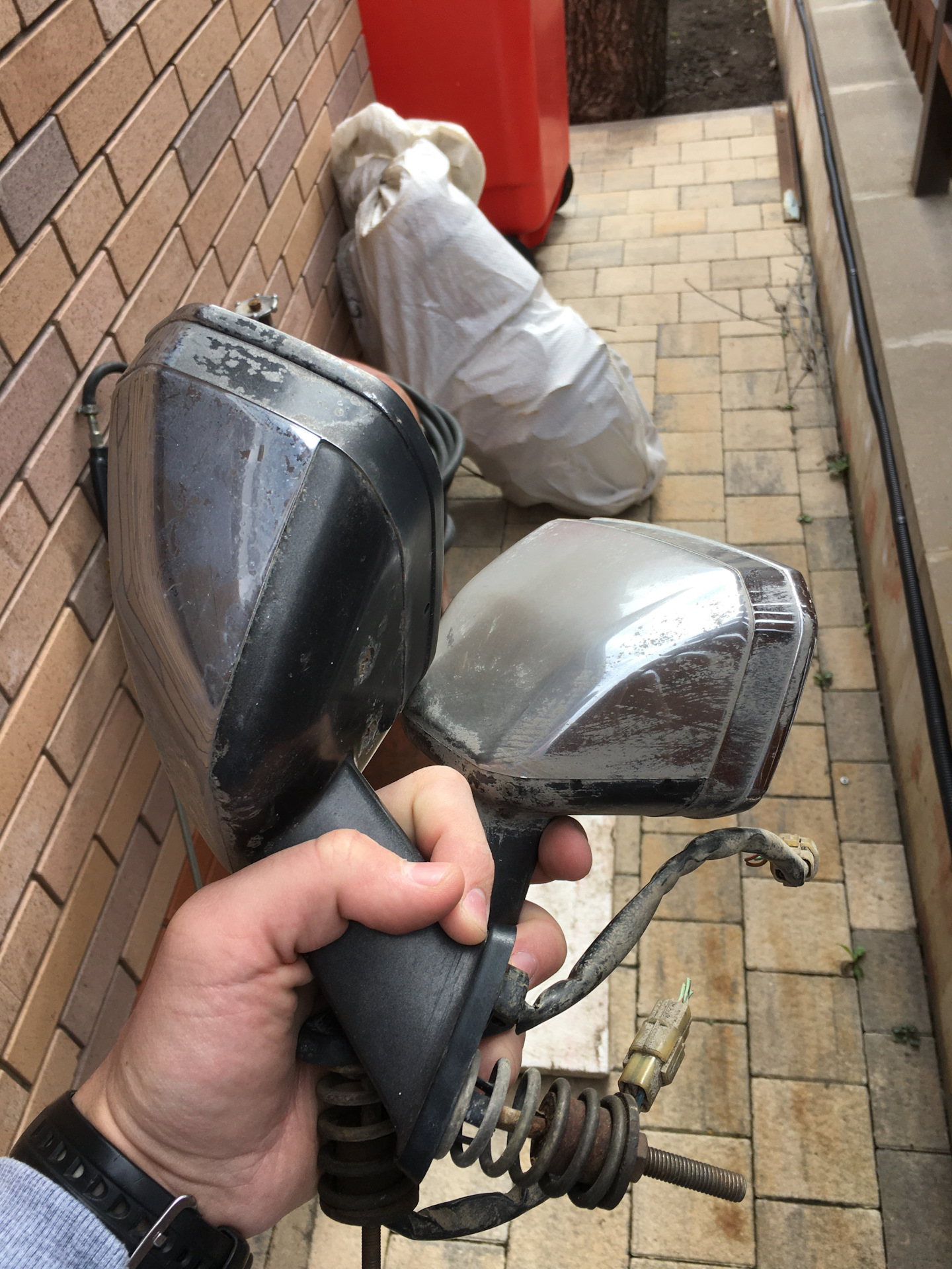 Вскользь затрону тему зеркал на крыльях. В моем понимании машина должна быть стоковым стоком, поэтому к любым изменениям внешности или тех. характеристик авто я отношусь крайне скептически. Но вот на пару изменений я был готов — 1) длинные бампера от MS123/125 и 2) зеркала на крылья. Эти мысли витали в моей голове еще до покупки авто, поэтому я примерно понимал редкость данных вещей. И после покупки я стал искать. Долго. Прошли месяцы, ни рогов, ни бамперов я так и не находил. Уже решил ставить рестайловые зеркала на двери. К моему счастью, с ними у меня не складывалось — либо дорого, либо состояние не то, либо по одной штуке. Плюсом я искал зеркала без электрического складывания — в моем доресте такой функции не предусмотрено в принципе. И вот в один чудный мартовский день я вижу объявление о продаже рогов от 120 крауна. Недолго думая, выкупаю их. Состояние среднее — но другого не дано. Получил, посмотрел, пообщался в чате по 120 краунам и понял, что рога-то от 110! Различия — лишь в более короткой и округлой ножке, остальное — совпадает. Отлично, значит встанут и в жизни никто их не отличит.
