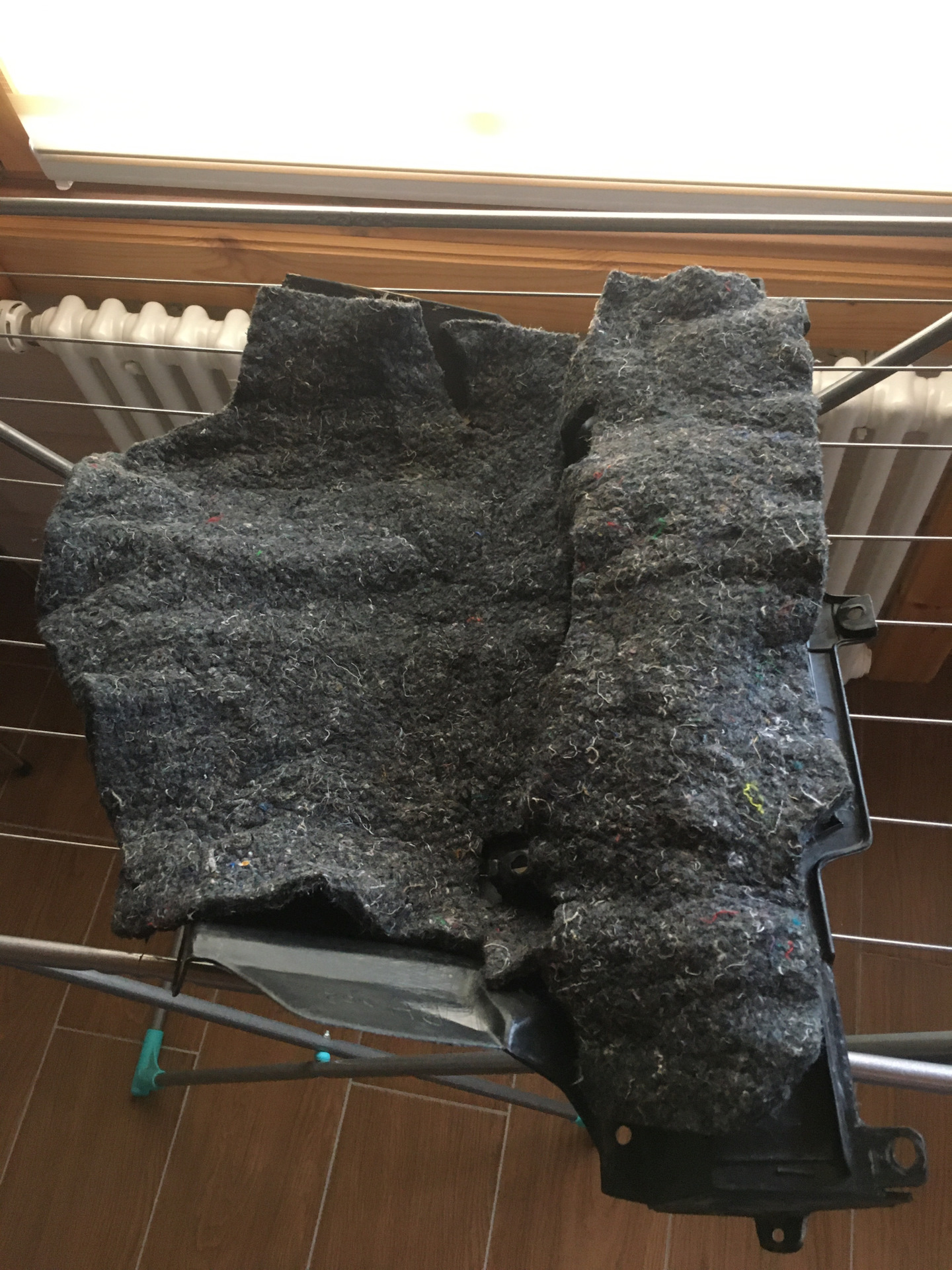 За долгие годы на дороге пыли в машине было немеренно. Казалось бы, шумка на детали на фото ниже (она находится в ногах у пассажира, закрывает печку и все, что под торпедой) закрыта от внешней среды практически полностью, однако в процессе стирки воду в тазу я менял раз 10 — и 8 из них она была черной от грязи.