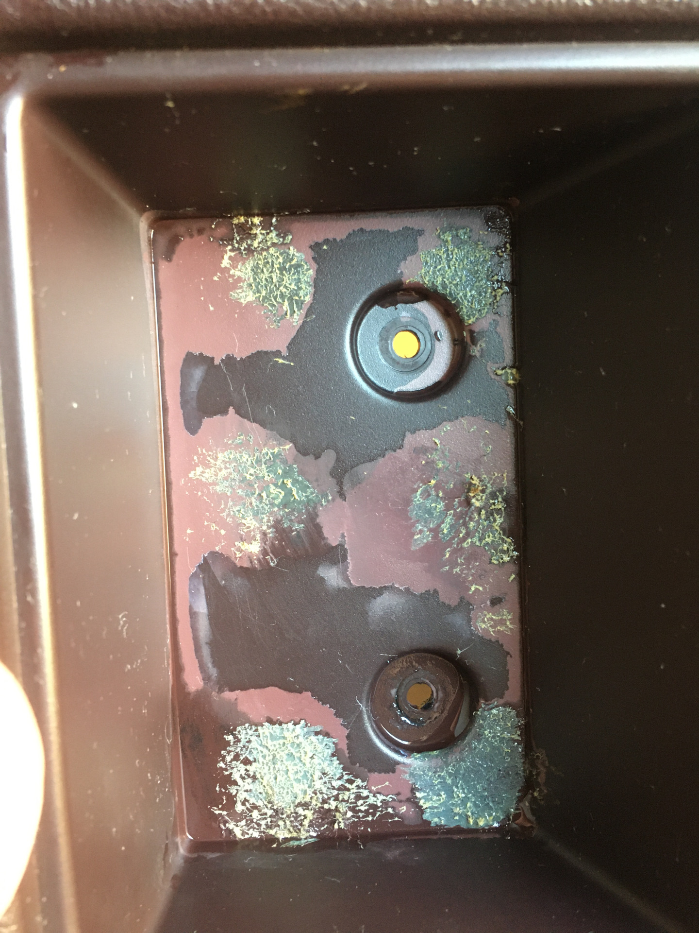 Достав из заначек новых деталей контрактный бардачок решил глянуть, требует ли он чистки. Увидел в переднем ящичке следы от клея (как я узнал потом — там должен быть коврик, который закрывает днище ящичка, видимо этот коврик и клеили). Попытавшись оттереть спиртом не пришел ни к какому результату. Что же сделать? Правильно, замочить спиртом. Именно такие мысли были в моей бренной голове. А потом случилось то, что вы видите на фото ниже. Клей не оттерся толком, а вот краска сошла. Беда.