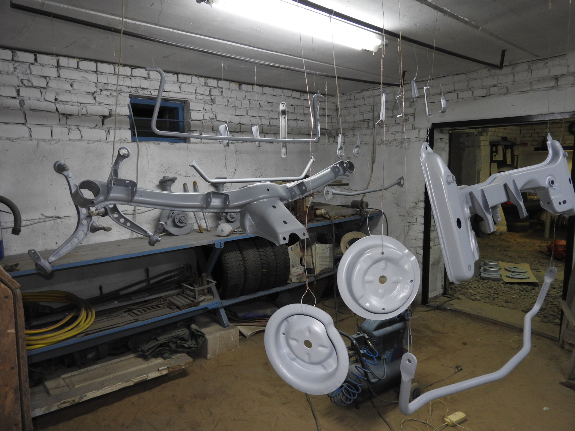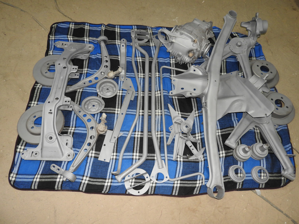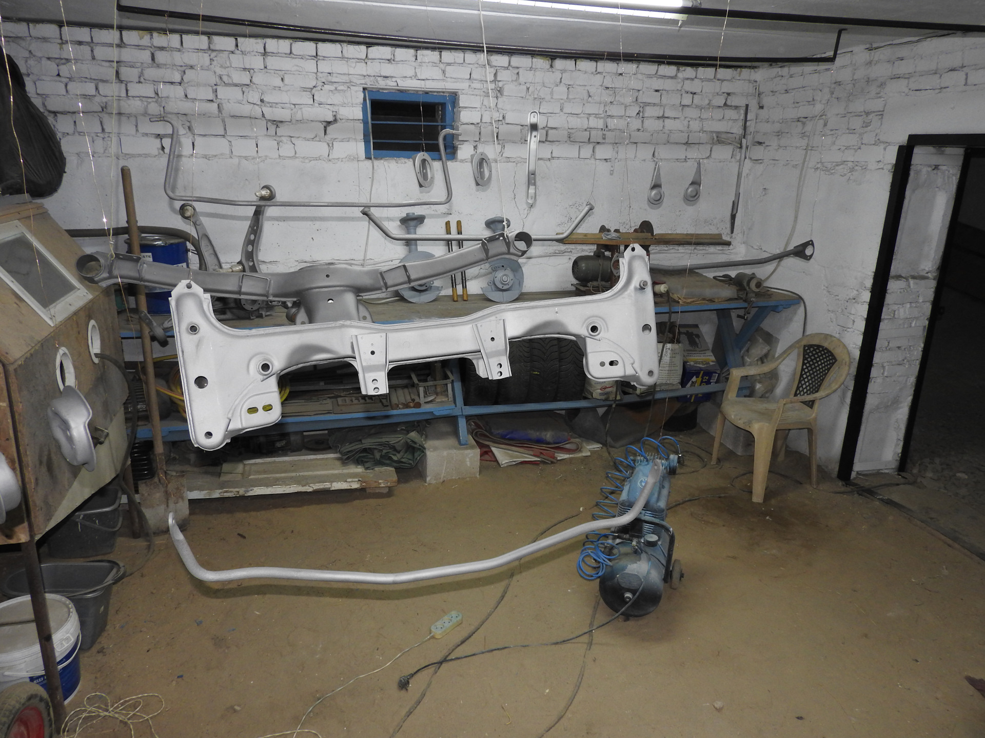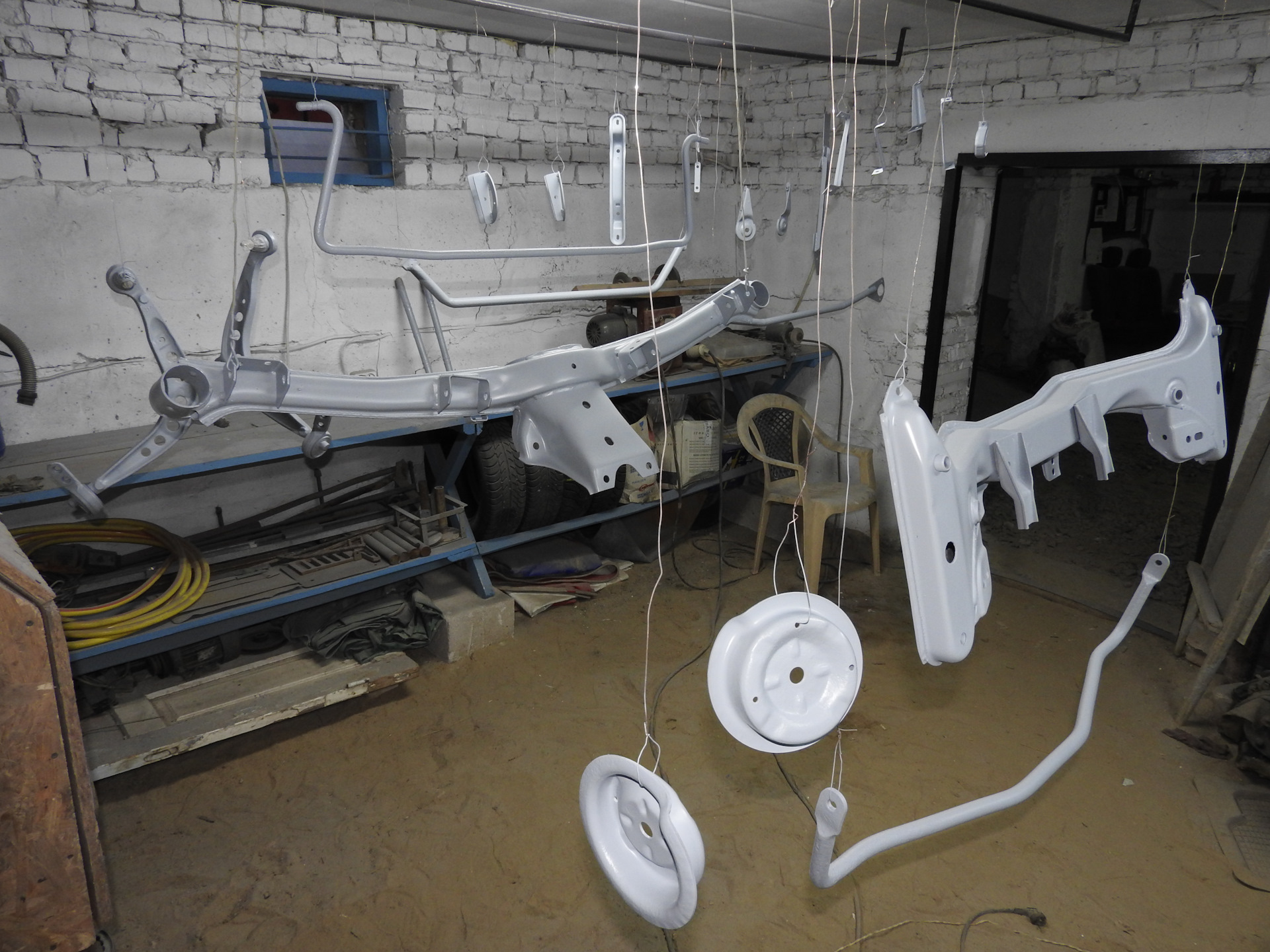 Отпесочил все детали ходовой. Мелкие и менее ржавые детали песочил дома, а оч ржавые задние рычаги, редуктор пришлось везти на промышленную песочку. Для самодельной нужен или компрессор мощнее, или чет с подачей песка делать — оч долго и геморно нужно песочить. И вытяжка нужна, а то это ппц с пылью… В общем, вот готовый результат песочки:
