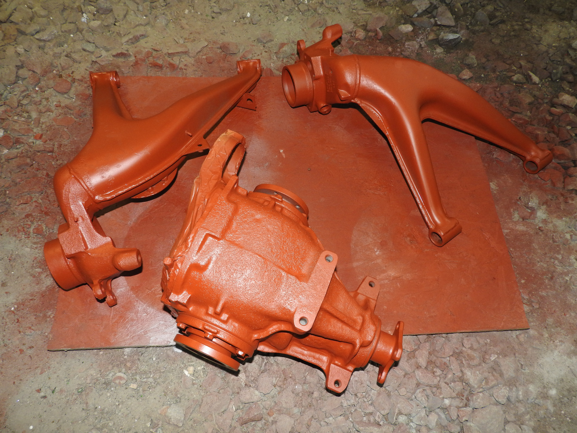 Как я уже говорил, задние рычаги и редуктор были оч сильно ржавыми, и даже после промышленной песочки на них на следующий день стали появляться точки ржавчины в порах чугуна. Поэтому еще их слегка почистил и задул кислотным грунтом.