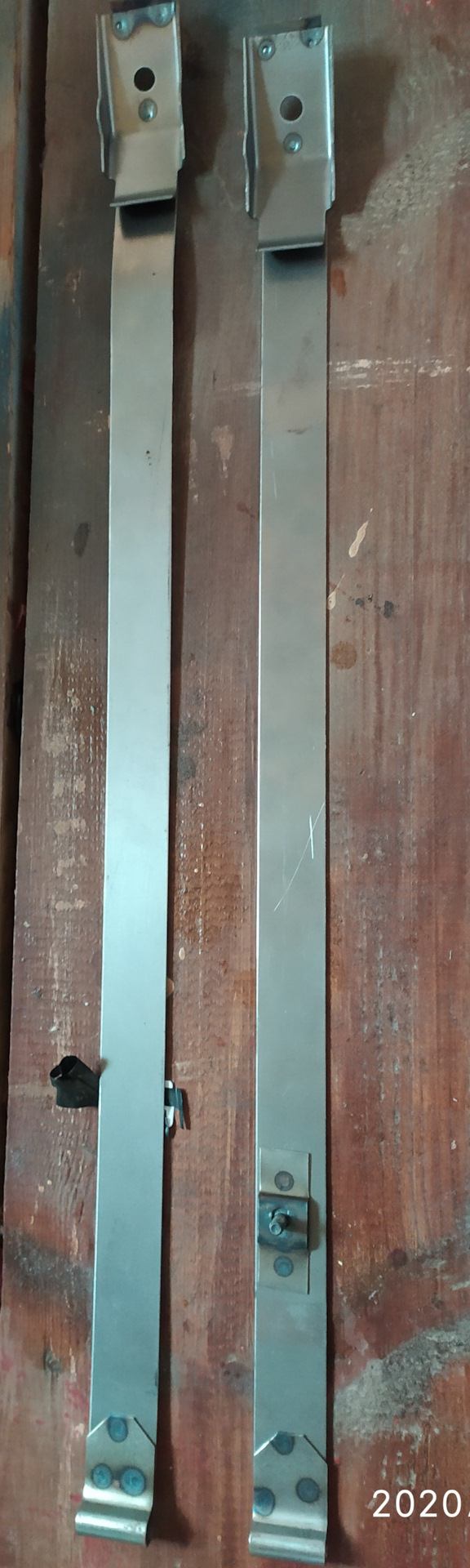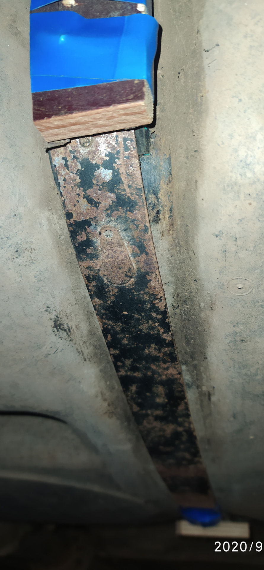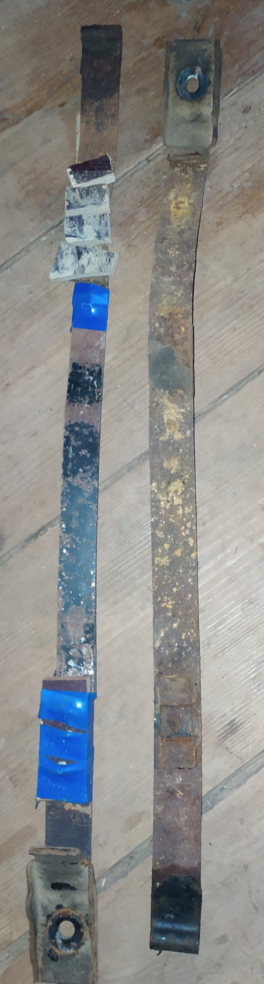 По традиции каждый год обрабатываю мовилем, и этой осенью разбрызрал баллон мовиля. Ещё немного помазал кисточкой из банки. Заглянул под машину и увидел что торчит конец правого хомута крепления бензобака. Вечер потратил на то, чтобы соединить уцелевшие концы стальной полоской на саморезы. На следующий день поехал в город искать хомуты. Приобрел калиновский комплект.
