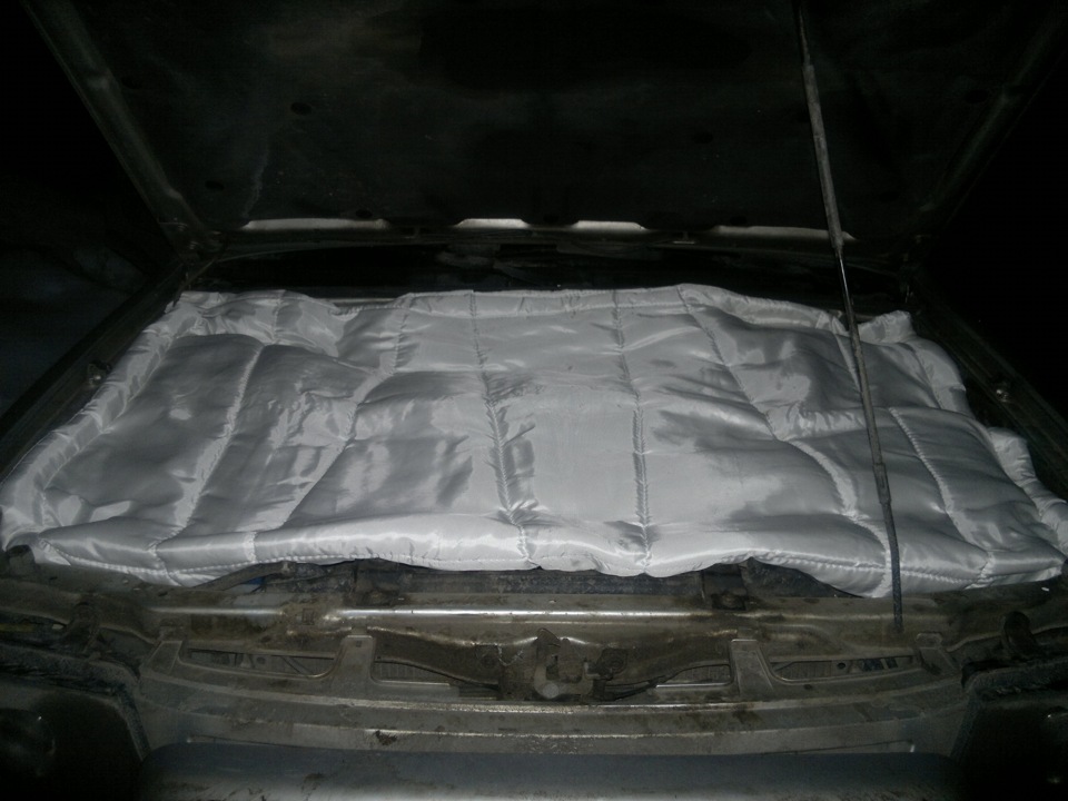 У мня все проще, движущихся частей и механизмов сверху нету, лежит отлично, машина прогревается быстрее, остывает дольше, одеяло лежит на экране от турбины, даже нет намеков на какое-либо повреждение от температуры (в прошлом году на том месте сплавилась теплоизоляция для бань, которую я клал под капот).