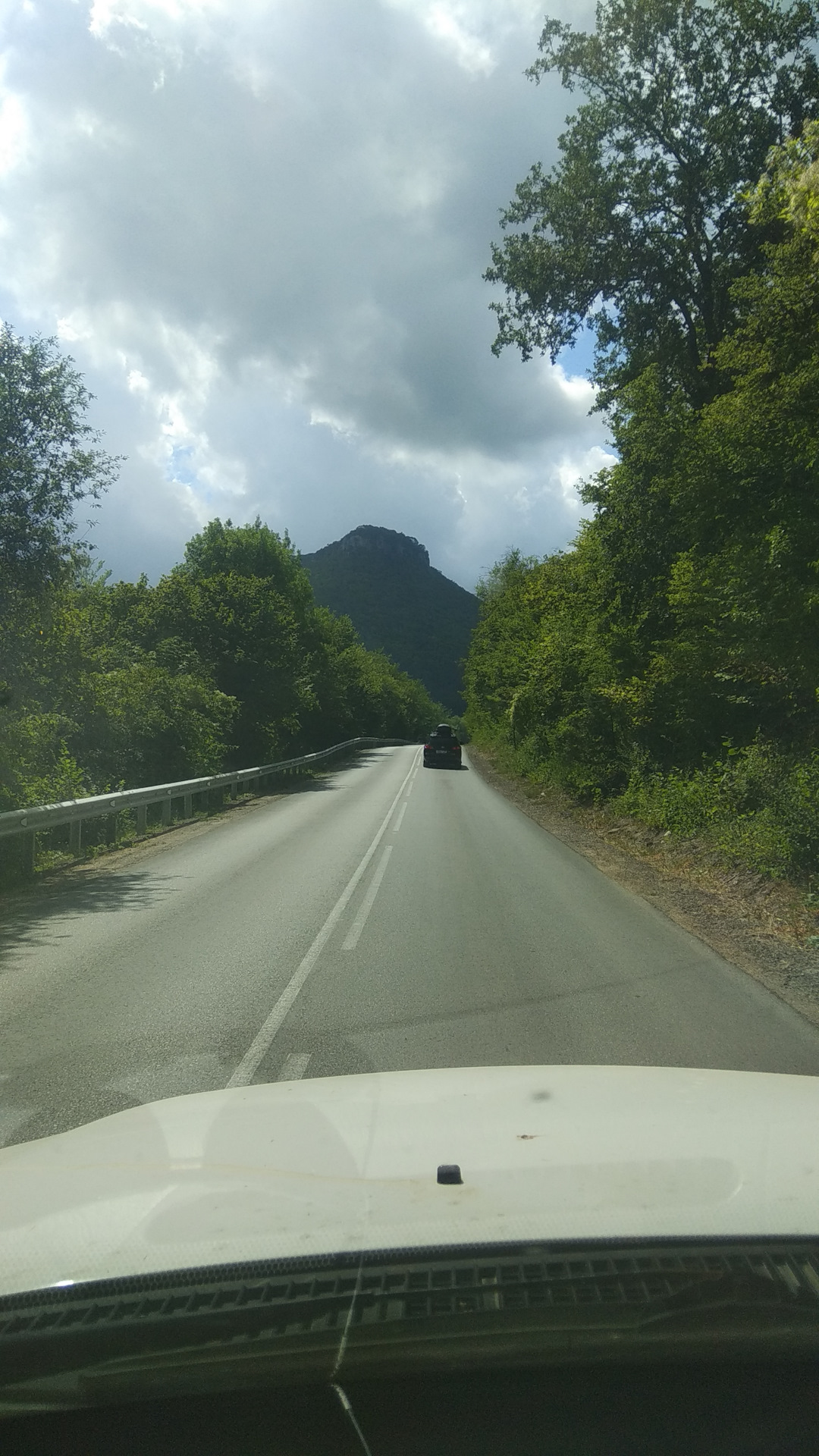 По дороге вниз нам попался питерский УАЗ Патриот. Надо сказать должное — парень отважный. Мало того, что он приехал с детьми из Питера, надо быть уверенным в себе на такой "дороге в небо", но и машина должна быть в порядке + сама дорога узкая. Места для разъезда со встречной машиной очень малы и их мало, порой при разъезде одно колесо шло прямо по краю пропасти.