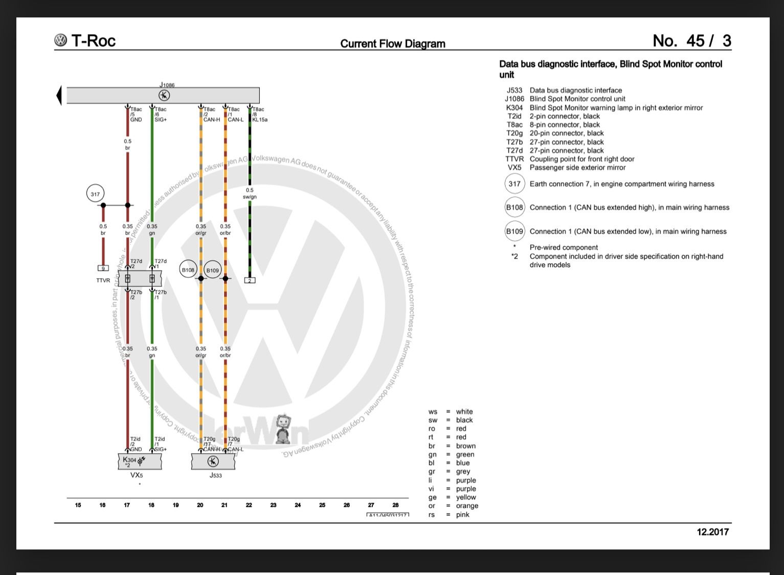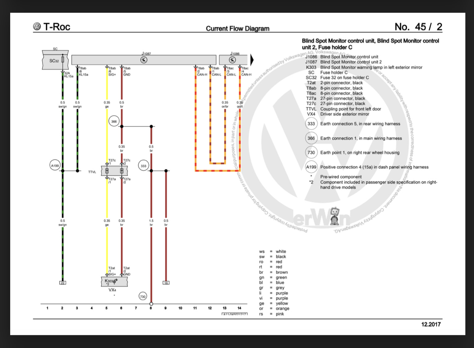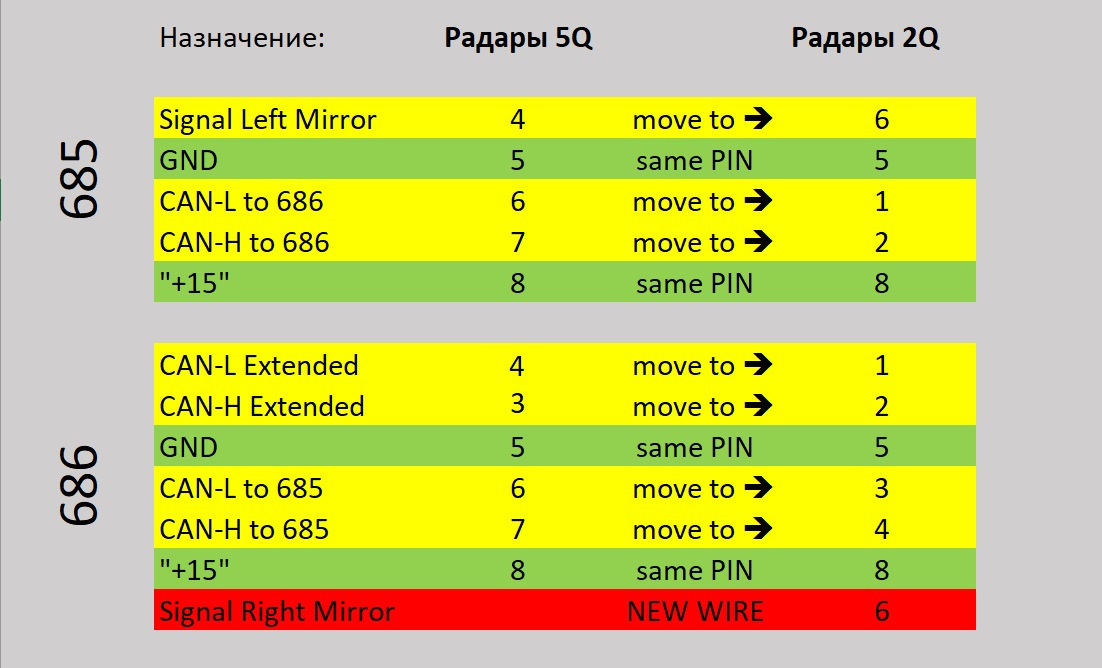 После недолгого изучения схем Side Assist от Golf 7 и T-Roc я нарисовал схемку перепиновки 5Q в 2Q: