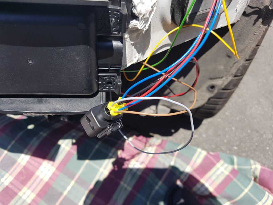 Скидываем бампер, подключаем и закрепляем проводку.