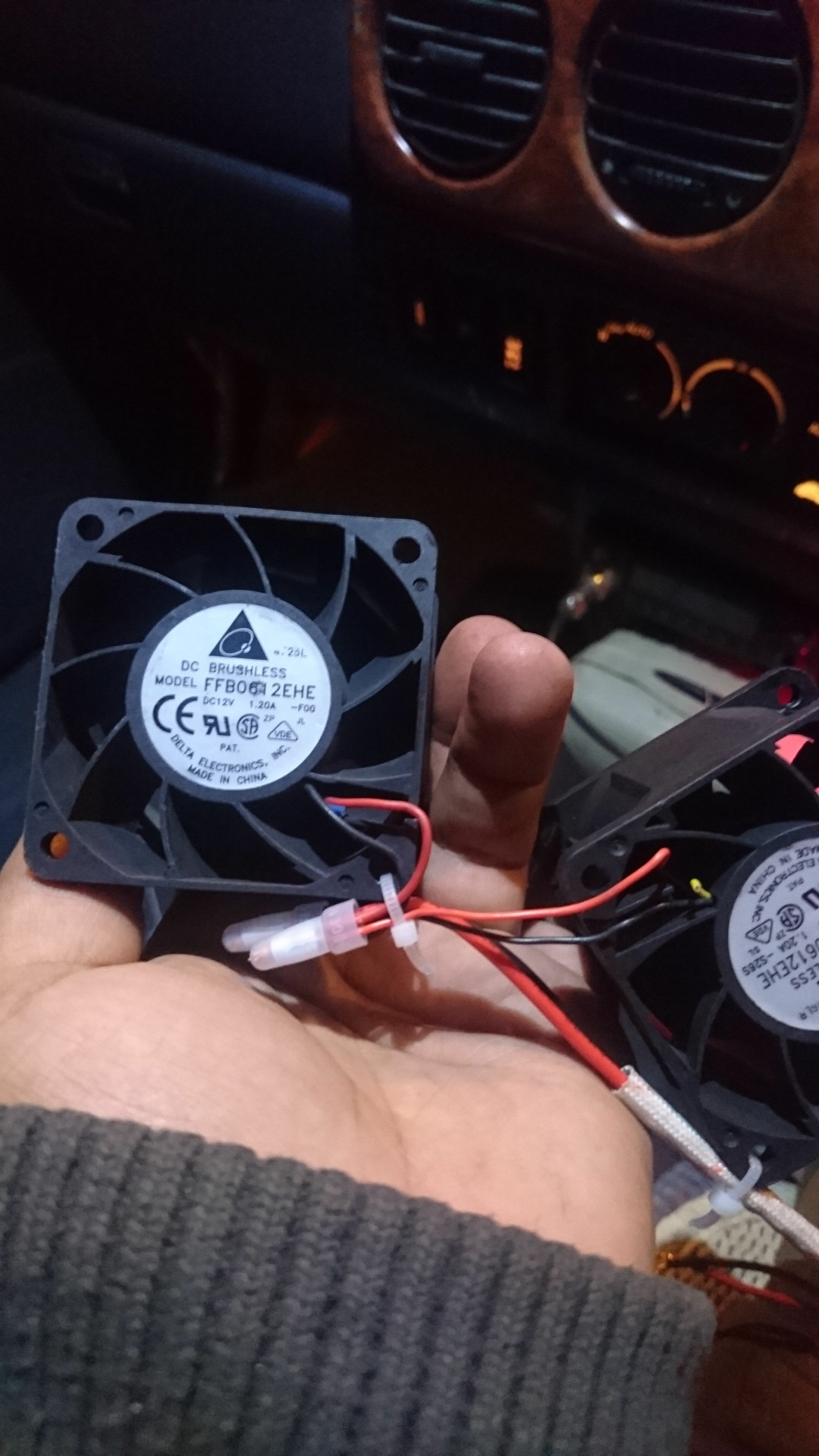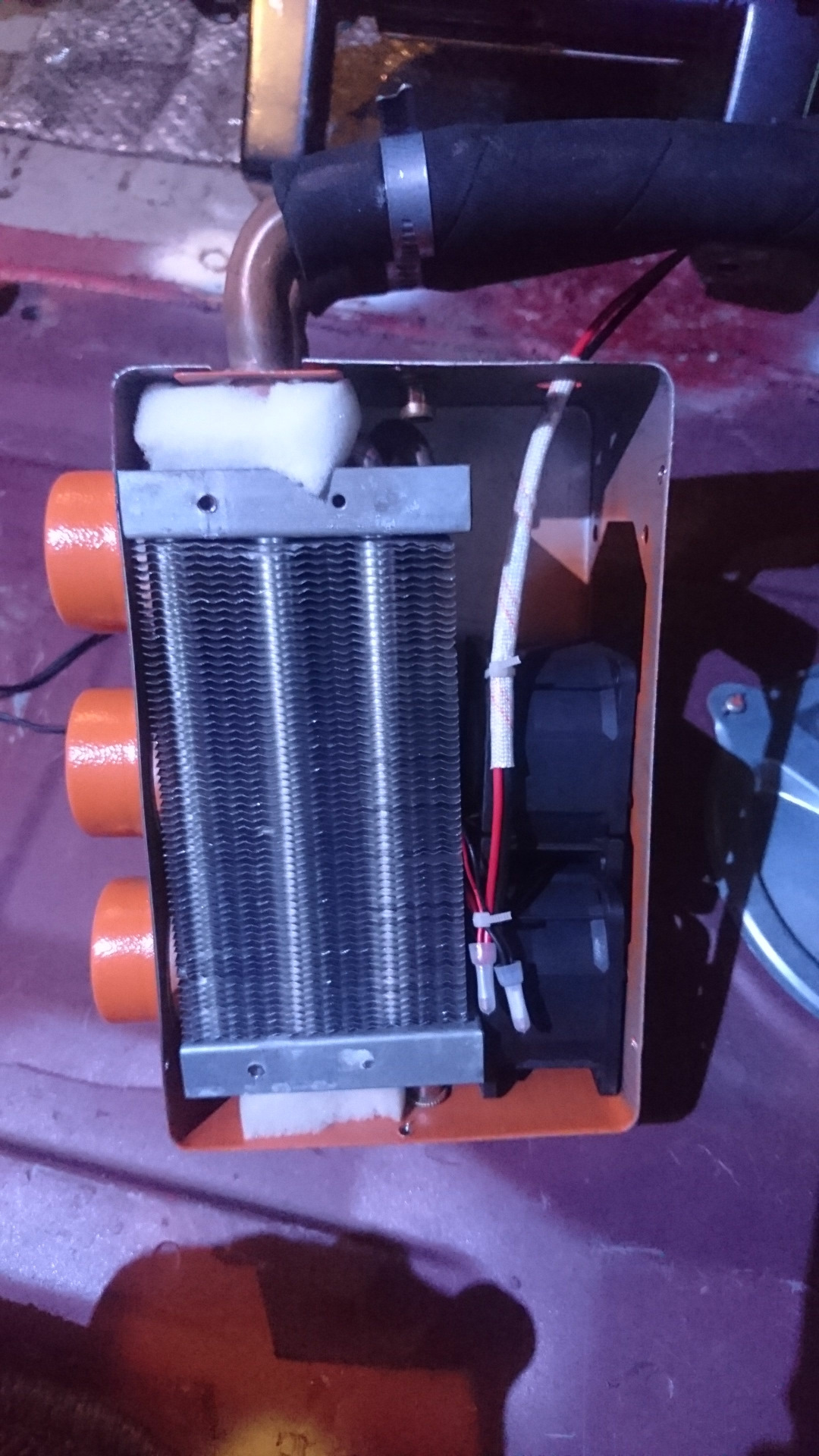 Холодно зимой на третьем ряду, а там у меня изофикс. Значит надо. Есть 2 пути решения параллельно и последовательно, по салону или по улице. Вариантов много, есть свои +и- в обоих случаях. Я решил упростить, через улицу, последовательно. Вместо патрубка выхода с печки установил шланги подачи и обратки второй печи. Пока без помпы. На оборотах до шланга не дотронуться, на холостых тёплый чуть. Решаемо доп помпой. Выход реализован стандартным жигулёвским способом, 16 сечение шланга. На дно корпуса китайской печи с 3 соплами и шумными вентиляторами производительностью 8000 в минуту, приклеена липкая лента, чтобы не летал под сидушкой. Задача была сохранить полезное пространство в салоне, к тому же место между сиденьем и стенкой занято ионизатором.