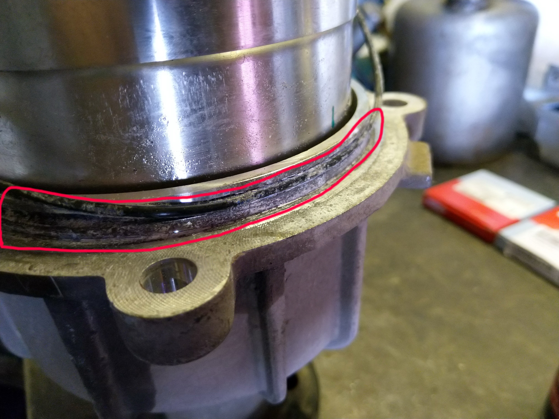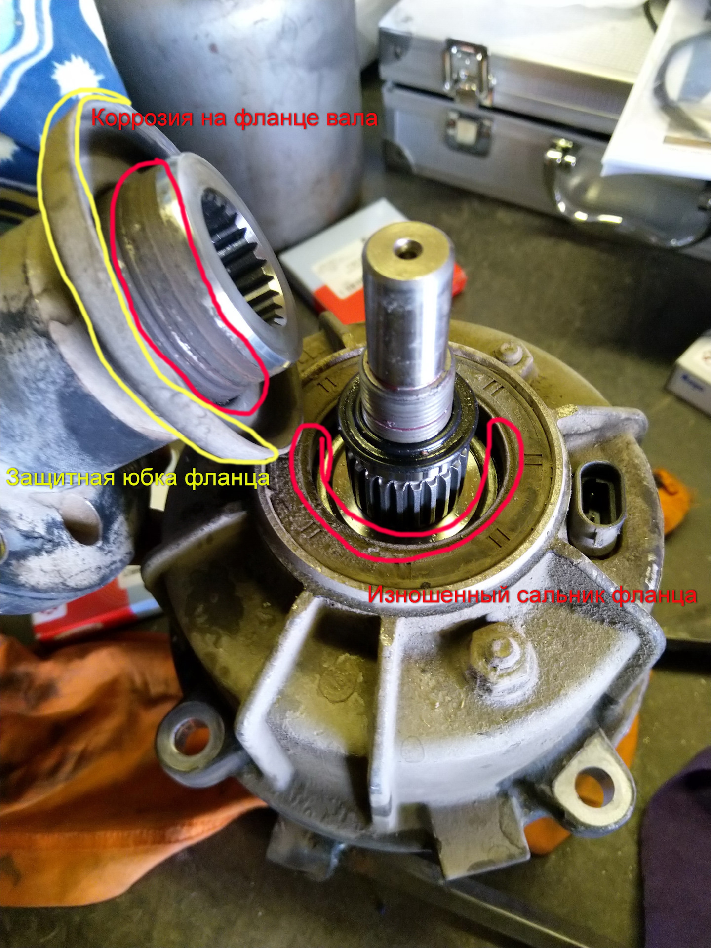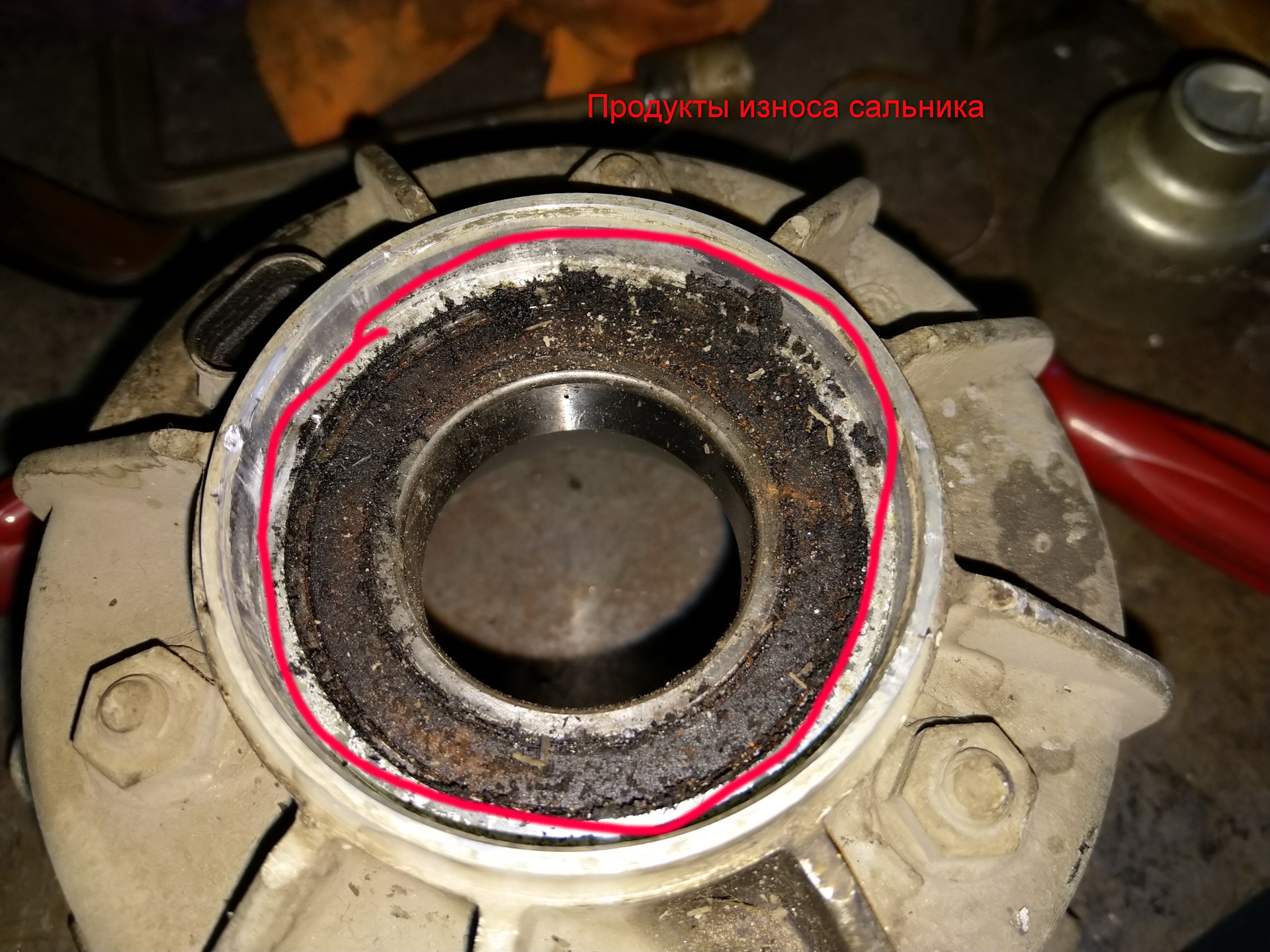 Фланец от коррозии зачистил «нулёвкой», сальник в процессе ремонта заменил. Хорошо, что у нас на фланце установлена защитная металлическая юбка, которая защищает сальник от грязи, если бы её не было, то сальник «кончился» бы гораздо раньше, такая проблема есть на корейцах с аналогичной муфтой ПП, у них нет этой юбки. На фото хорошо видно состояние сальника и следы его выработки.