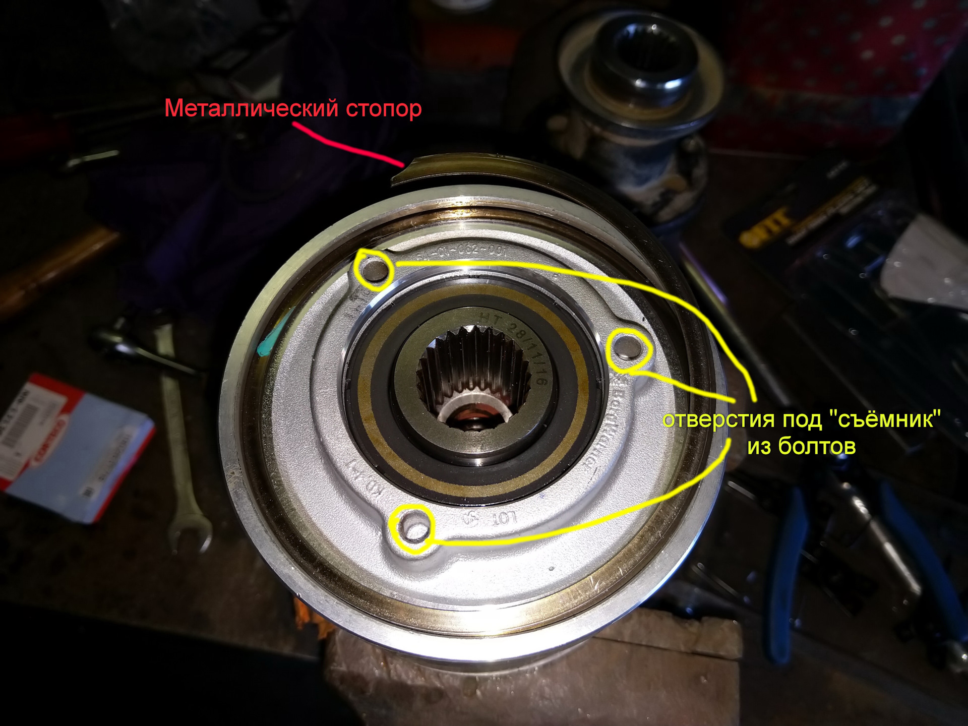 Снизу аккуратно поддеваем и снимаем стопорное кольцо и при помощи самодельного съёмника из трёх длинных болтов подобранных по размеру отверстий в крышке потихоньку снял крышку корпуса с сальником, не повредив уплотнительную резинку.