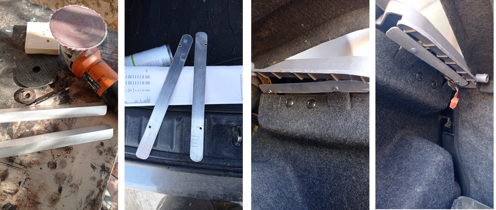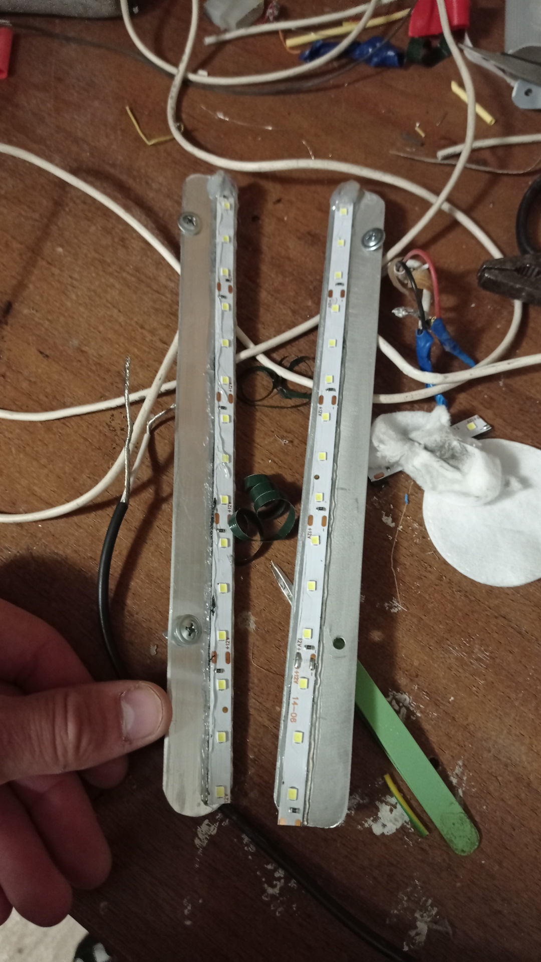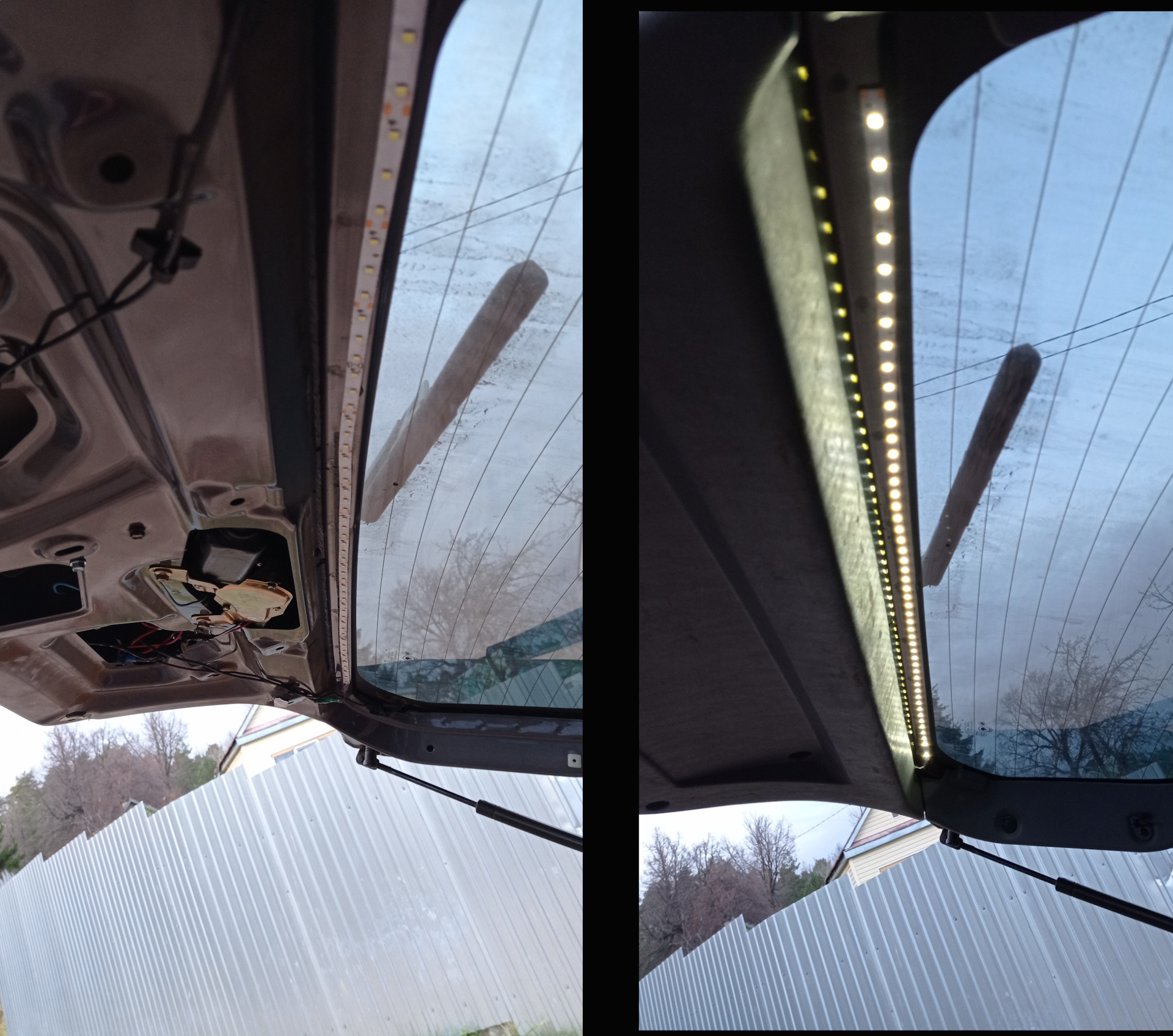 Наклеил полосу led ленты на крышку, Прокинул провод через всю дверь, гофру и вывел около полки + на место штатного плафона и на другую сторону, закрепил алюминиевую полосу около 25 см, с 1-ой полосой led ленты.