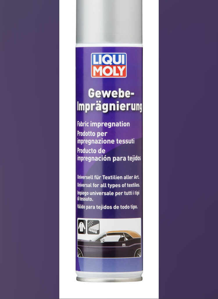 водо/грязеотталкивающей пропиткой Ликв Моли, предназначена она для пропитки тканевой крыши у кабриолетов в сезон осень/весна.