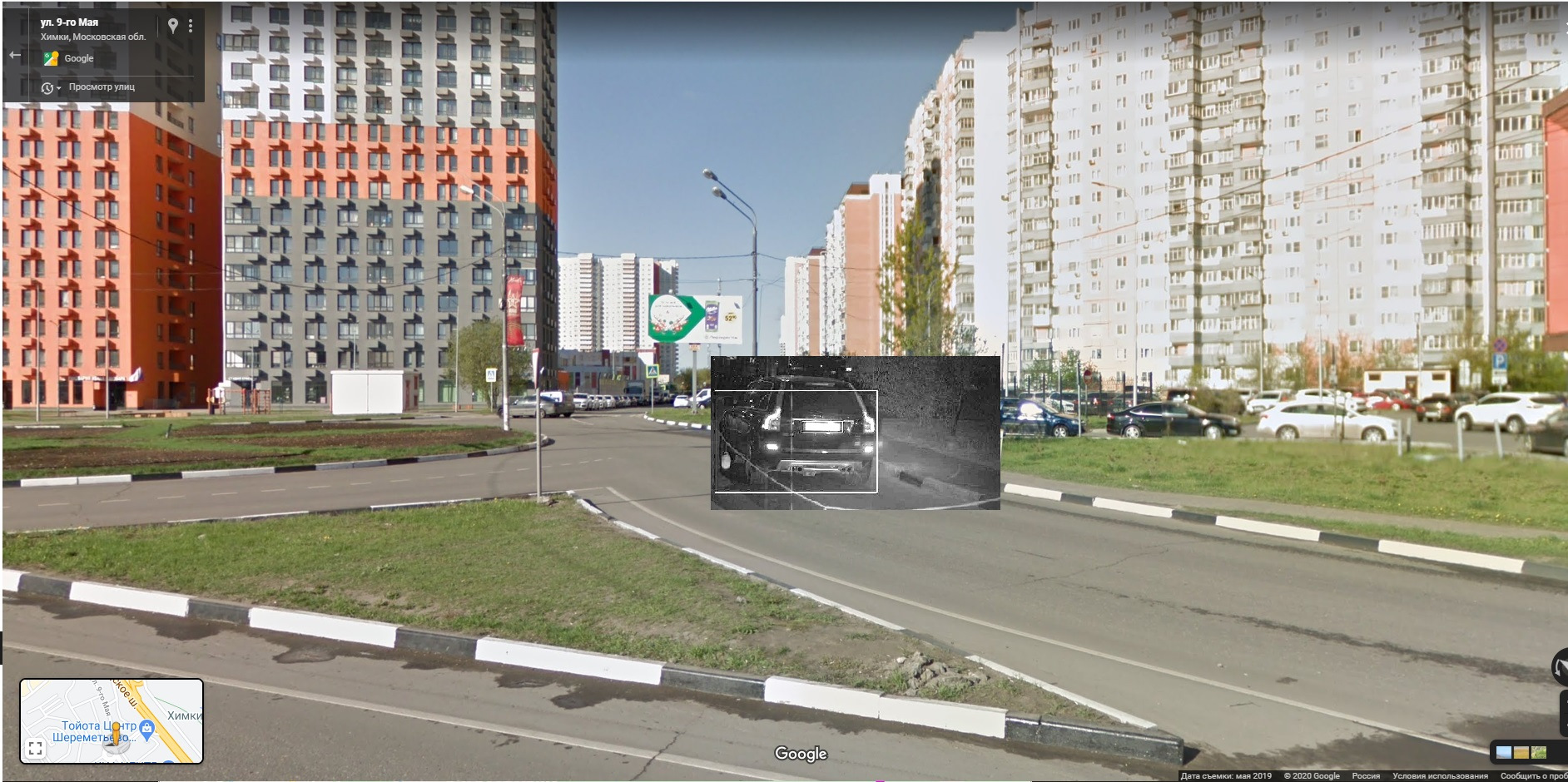 Осветлил немного картинку с штрафа, нашел на фоне опознавательные совпадения в виде деревьев и бордюра, а так же столб за своей машиной. Нашел наиболее подходящий ракурс на гугл.панорамах… Сопоставил картинки.