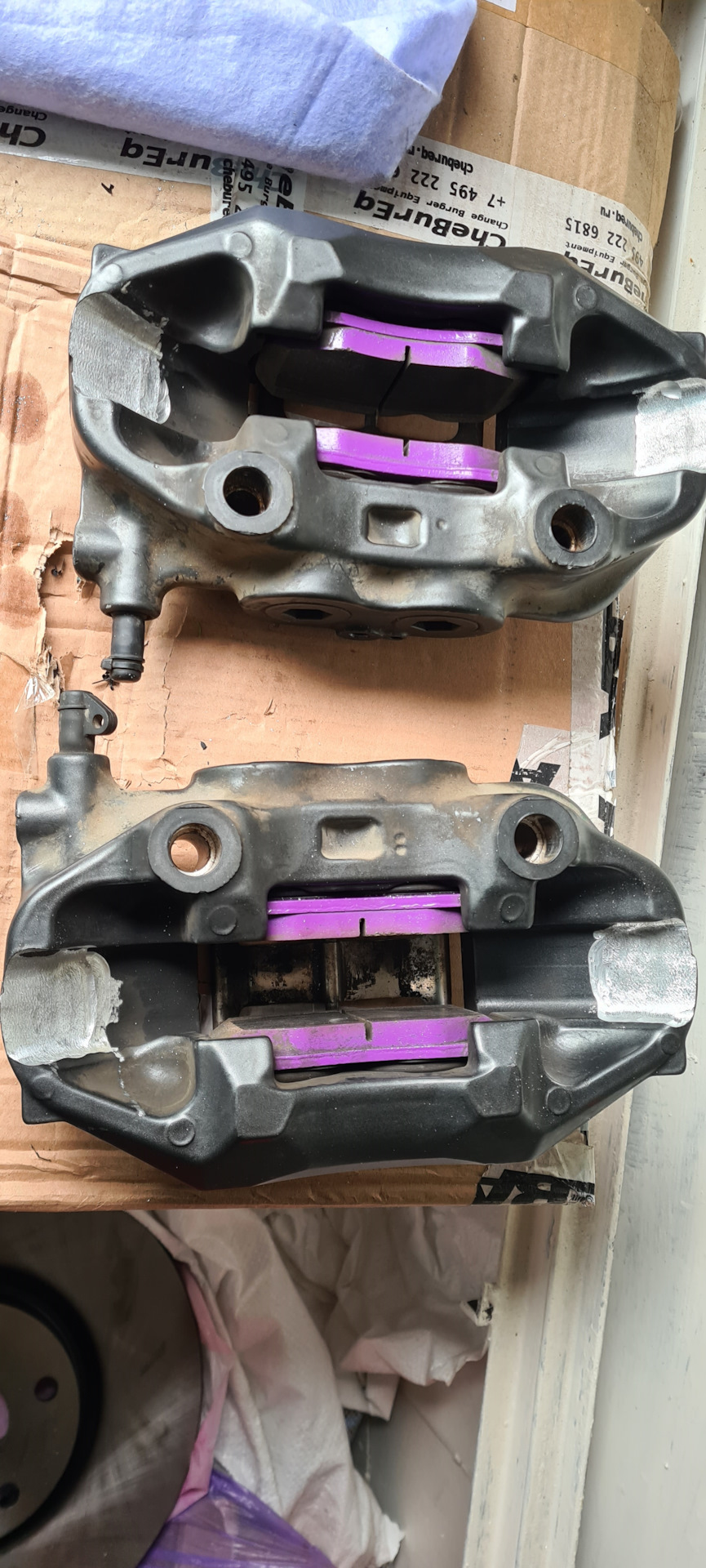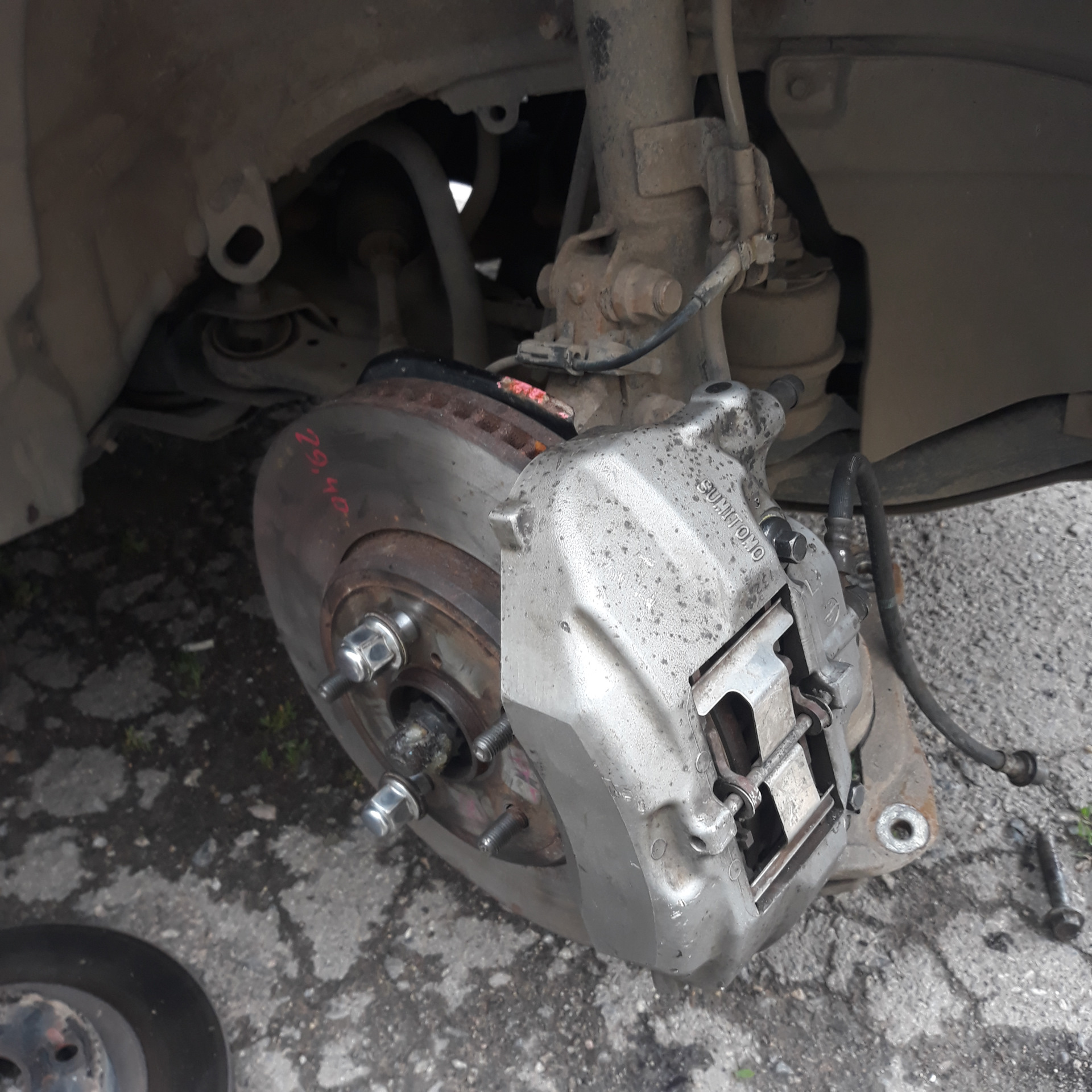 Читал и смотрел про установку тормозов от тайота цельсиор и увидел одну рекламу этих проставок, так вот и решил написать как это делается легко и просто.Был куплен комплект диски на 315мм и суппорта.Дальше покупается квадрат стальной 20×20мм, снимаем далее колесо, скобу вместе с суппортом и тормозной диск.После этого вы видите места крепления скобы, к этим местам прикладывается квадрат и отрезается в размер, далее размечается отвестия, сверлятся и нарезается резба по стоковые болты крепления скобы, но надо разметить таким образом, чтобы квадрат был на 2мм ниже так называемых ушей, потом вы их сточите.После того как резба в квадрате нарезана, прикручиваем его и обводим маркером место где он соприкасается, это место нужно будет снять на 2мм.После того как всё сделано прикручиваем всё обратно, берем суппорт, срезаем на нем втулки металлические, прикручеваем тормозной диск и одеваем суппорт с новыми колодками, размечаем новые 2 отверстия для крепления суппорта к квадрату, тут понадобятся 2 втулки, т.к болты я делал не на 18мм, а на 12 мм, втулки ставятся внутрь отверстий суппортов и всё прикручивается, далее присоединяете шланг, прокачивате и балдеете от тормозов и что суппорта ставятся штуцером вверх все уже писали.