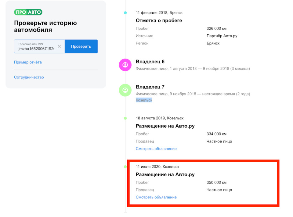 По отчётам Авто.ру Данное ТС продавалось совсем недавно 11 июля 2020 в г.Козельск