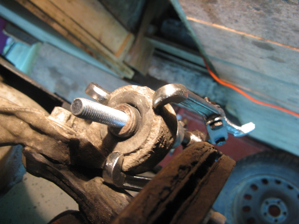 6. Приступаем к выпрессовке нижнего сайлентблока вертикального рычага. Тут необходимо иметь хороший двухлапый съёмник, трёхлапый съёмник хоть и хорош, но им крайне сложно подлезть, двухлапый согнулся сразу же.