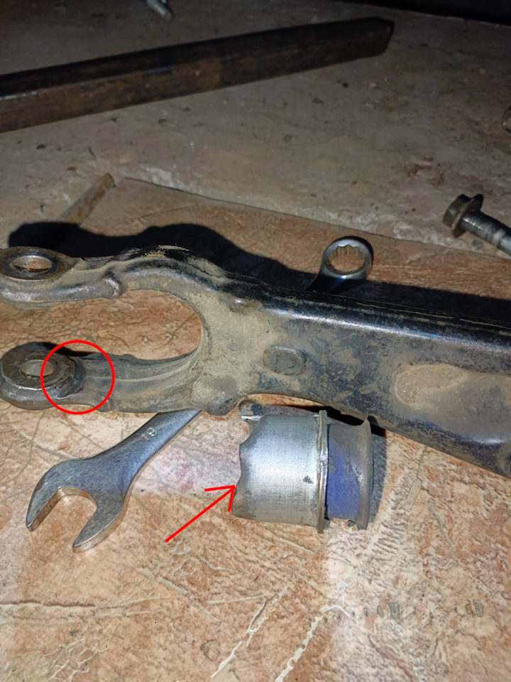 1) Когда затягивал первый сайлентблок, то не чистил и не шлифовал посадочное место, еле запрессовал сайлентблок, порвал болт на 10, пришлось ехать в магазин за более крепкими болтами. Второй сайлентблок когда прессовал, наждачкой шлифанул посадочное место и смазал графитовой смазкой, сайлентблок зашел легко. НО НЕ ДЕЛАЙТЕ ЭТОГО! Через день при старте на светофоре я услышал скрип, оказалось сайлентблок этот вышел из посадочного места. При разгоне поворотный кулак давит на внутреннюю втулку и выдавливает сайлентблок. Пришлось все переделывать.