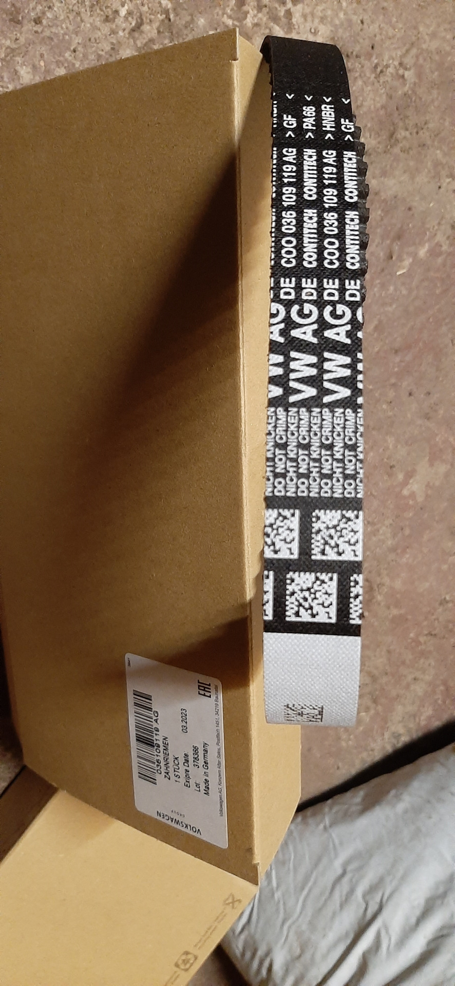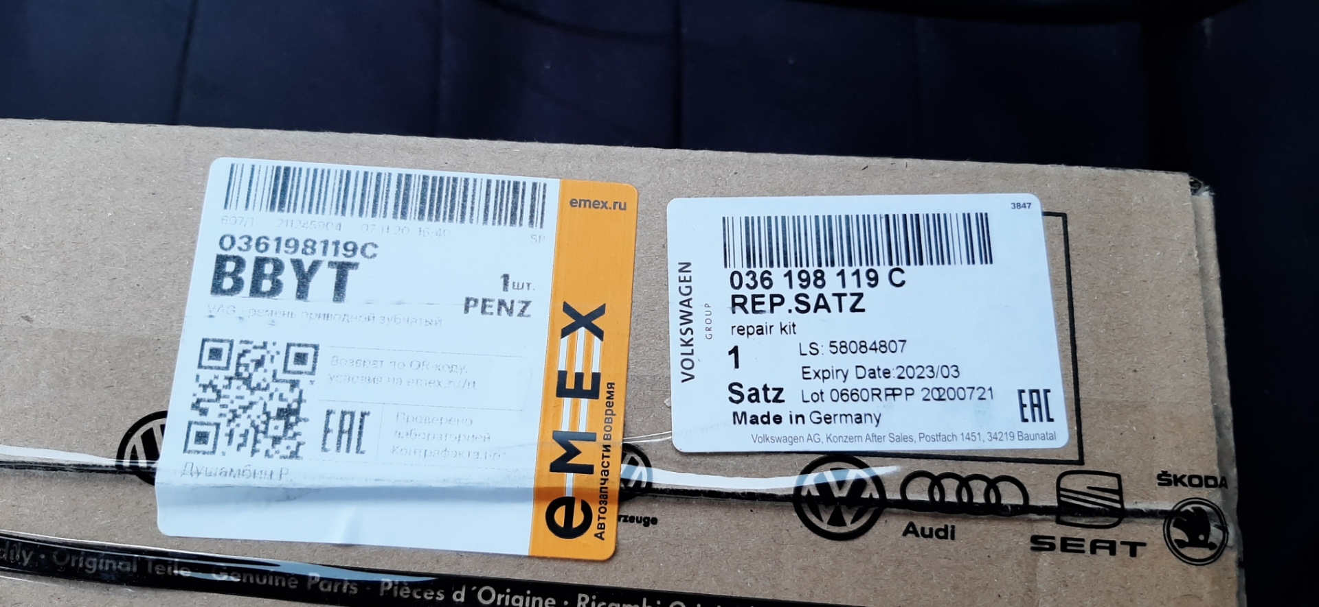 Заказал на emex комплект грм пр артикулу 036198119C в коробке лежат 3 ролика и две белые коробочки в которых ремни, на роликах выбит оригинальный номер.