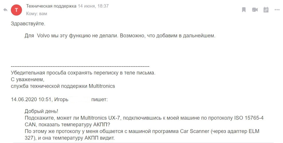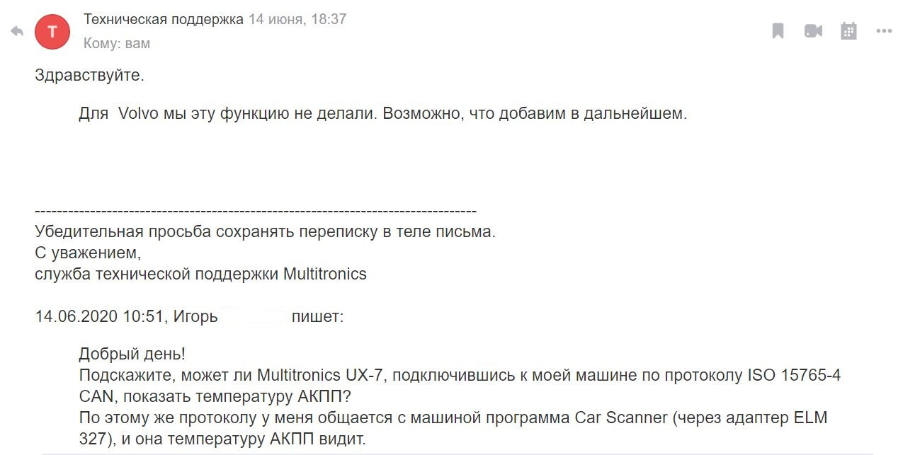 А вот тойотовцы клевали моск техподдержке Мультитроникса, и разработчики реализовали отслеживание температуры АКПП для коробки Aisin A750. Я писал в техподдержку по поводу коробаса VOLVO, но, видимо, им наш авто не интересен.