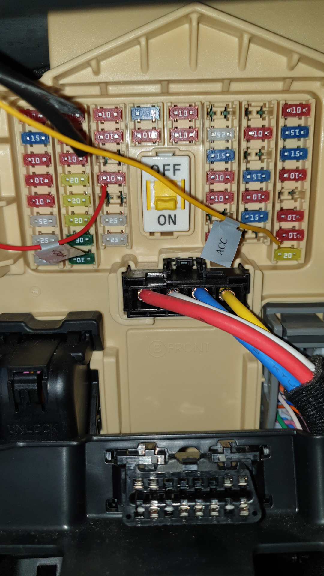 Протянул провода до блока предохранителей. Черный провод закрепил на минус: