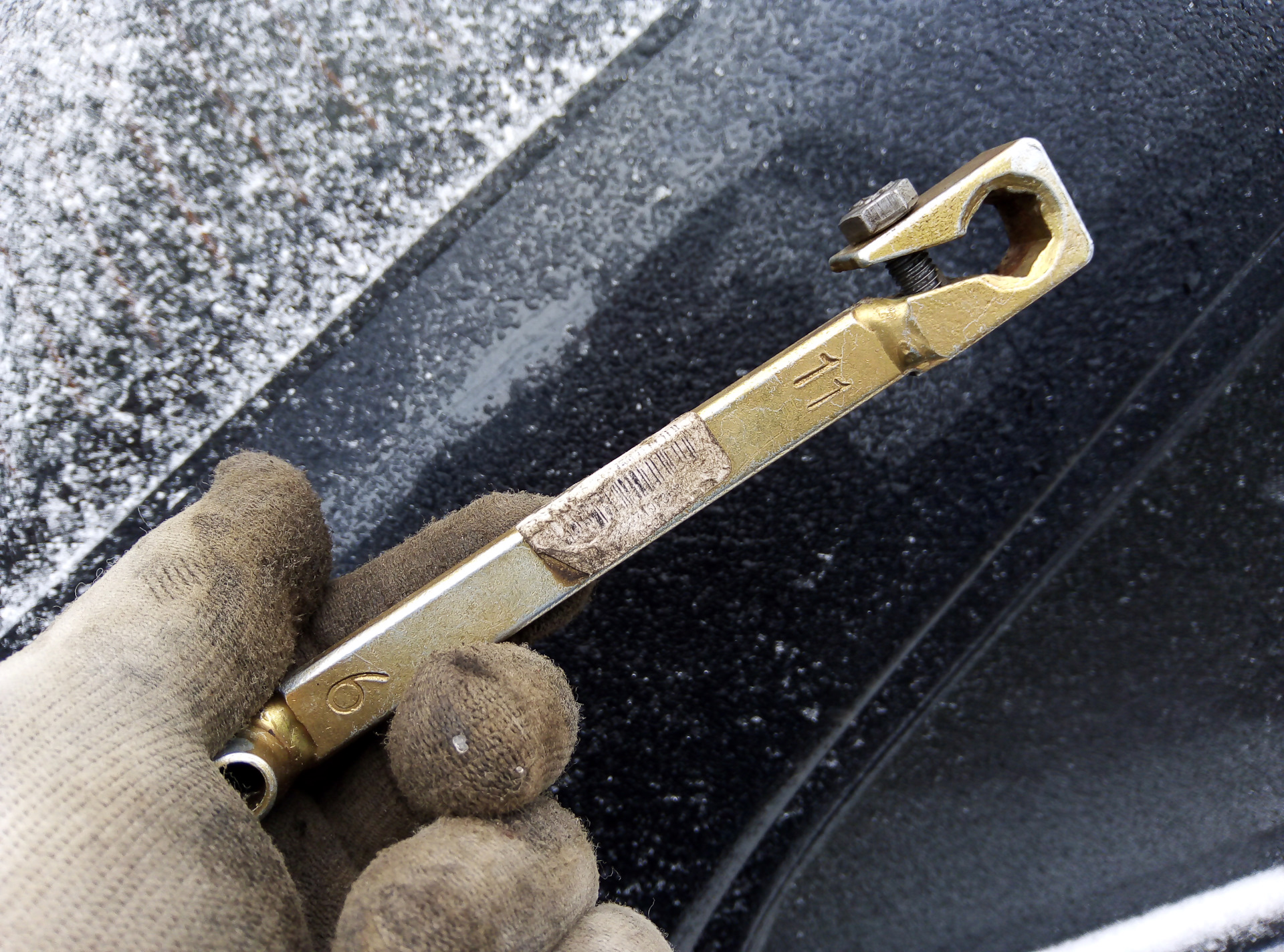— ключ для прокачки тормозов. Он так же сойдет для откручивания тормозной трубки. Купил обычный, называется АВТОМ, стороны на 9 и 11мм (с фиксатором, это важно), артикул — 10736 (156р), (нам понадобиться сторона с 11 мм).