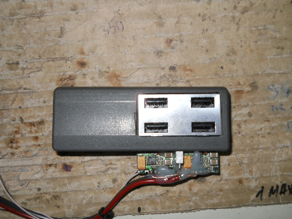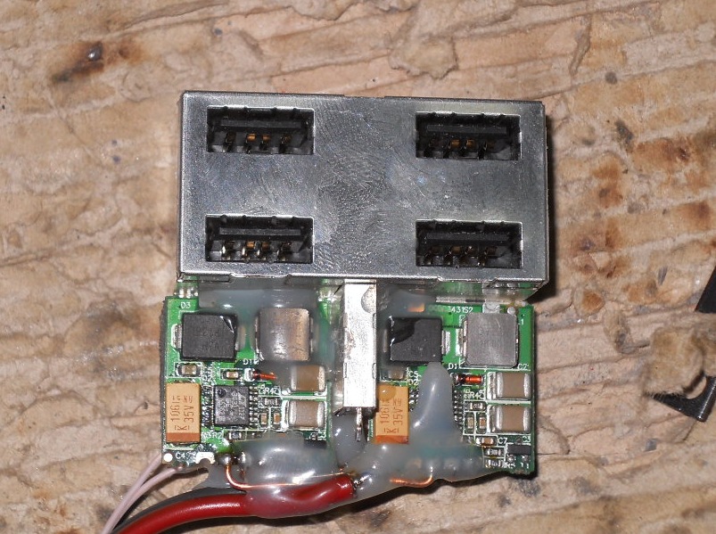 Исходя из этого количества (гипотетически одновременно заряжаемых) девайсов было выбрано количество зарядных разъёмов, тут как нельзя кстати под руку подвернулась колодка с 4-мя разъёмами, выпаянная из умершей материнки, и в неё же вклеено 2 DC-DC преобразователя 5 вольт по 2 А каждый, которые как раз подошли по месту: