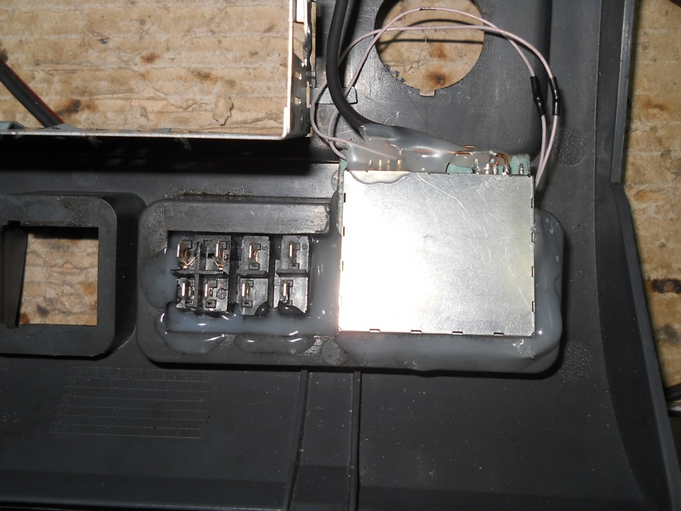 Врезаем чудо-кнопочки, мои любимые, светодиодик, и всё это дело вклеиваем термоклеем в консоль: