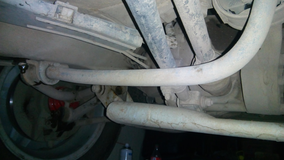 Открутил болты крепления стоек стаба к рычагу. Открутил хомуты крепления втулок и начал вытаскивать стаб… Ох и намучался я его вынимать. То выхлоп мешается, то в яму стаб упирается, кое как, с помощью какой-то матери, вынул стаб.