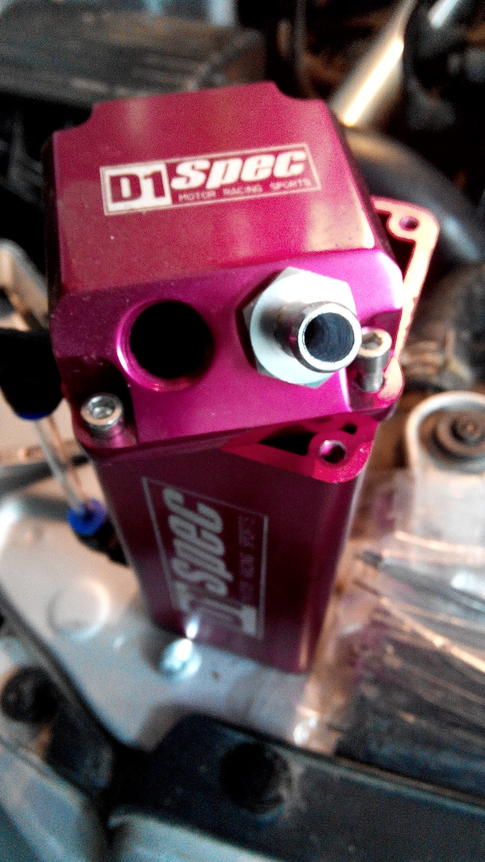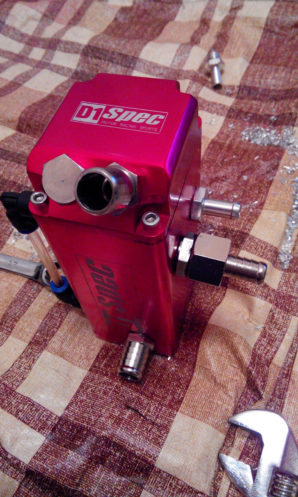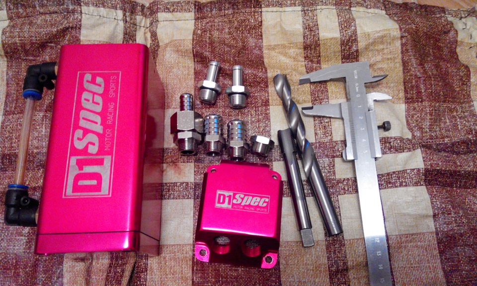 И последнее, что затянулось надолго — доработка маслопомойки. В стоке она не удовлетворяла моим требованиям, не хватало входов/выходов. Стараясь сделать по принципу "из гомна и ветра", а точнее вписаться в жесткие требования по бюджету, остановился на варианте с трубными штуцерами 3/8.