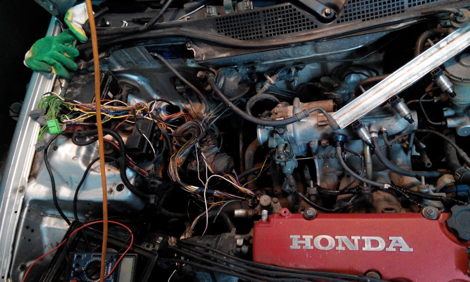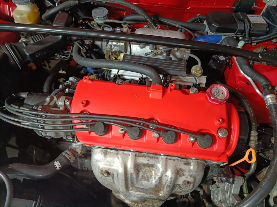 Собрав все то, что описано в первой части, я сразу начал ездить, попутно доделывая оставшиеся задачи и решая новые проблемы. Первый тестовый проезд по району и первый выход на буст закончился запахом масла в салоне и лужей под машиной. Благо, не успел уехать далеко. Надевая шланг маслоподачи на турбину, повредил его. И он рванул. Литра 2-2,5 свежего оригинального хондовского масла оказалось в подкапотке.